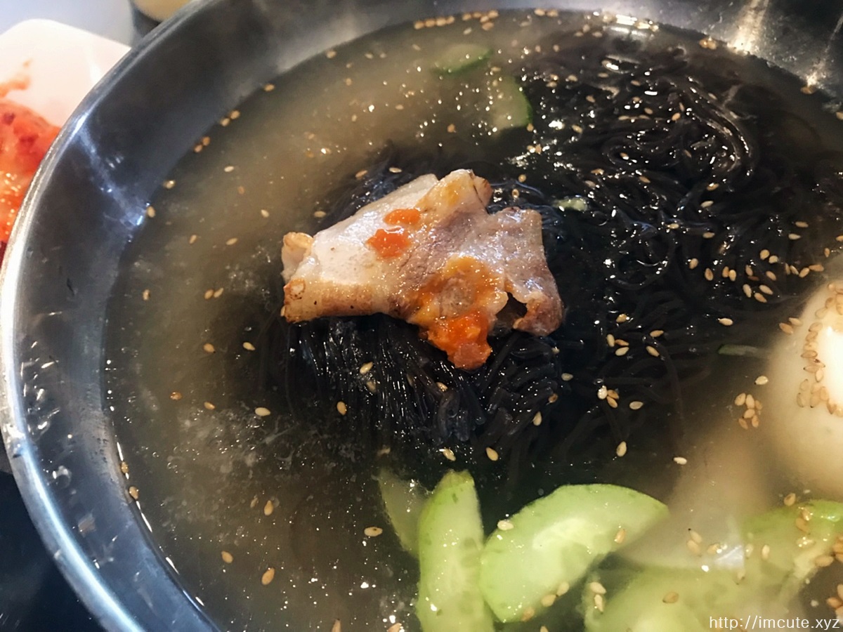뭔가 허해서 냉면까지. 칡냉면 스타일으로 면발이 검은색이고요 아삭아삭 오이에 시원한 국물은 얼음까지 얼어있답니다.