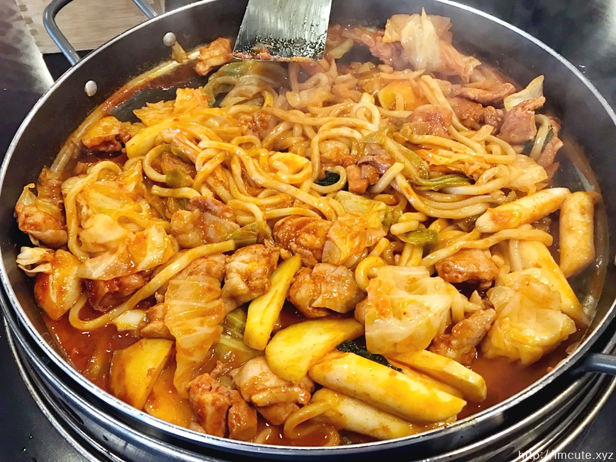 닭갈비에 모둠사리를 추가한 모습인데요 떡사리에 면사리 그리고 양배추가 정말 한가득이에요..!