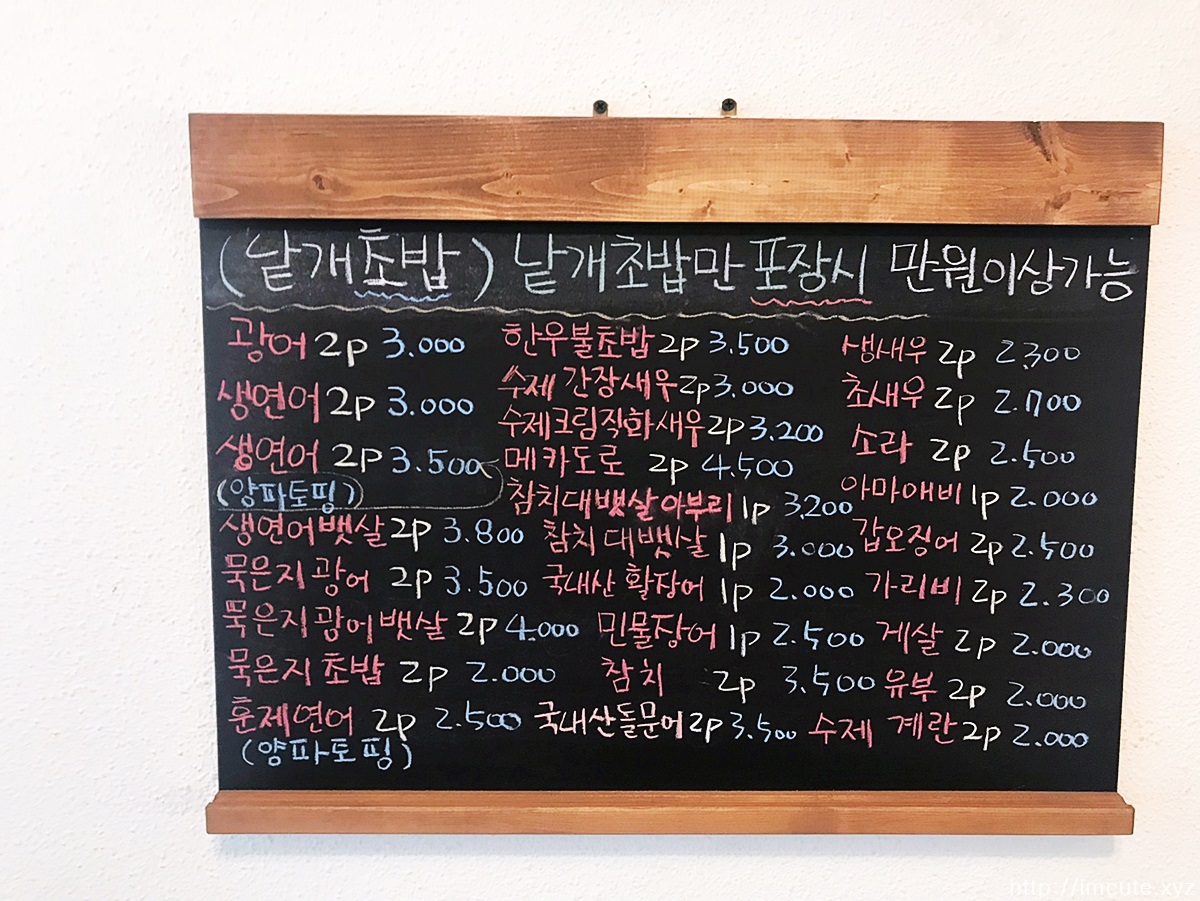 낱개초밥 포장시 만원이상은 가능하다고 하는데요 제가 제일 좋아하는건 생연어! 그리고 한우불초밥이랑 장어를 좋아해서 이것저것 보았어요.
