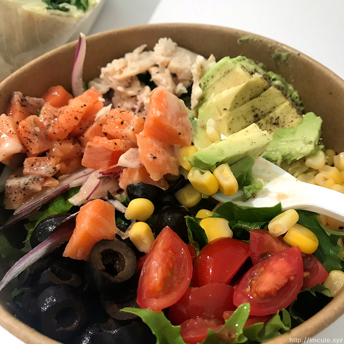 여러가지 재료~ 방울ㄹ토마토랑 콘샐러드, 올리브, 닭가슴살, 연어등 건강해보이는 재료가 한가득이었어요.