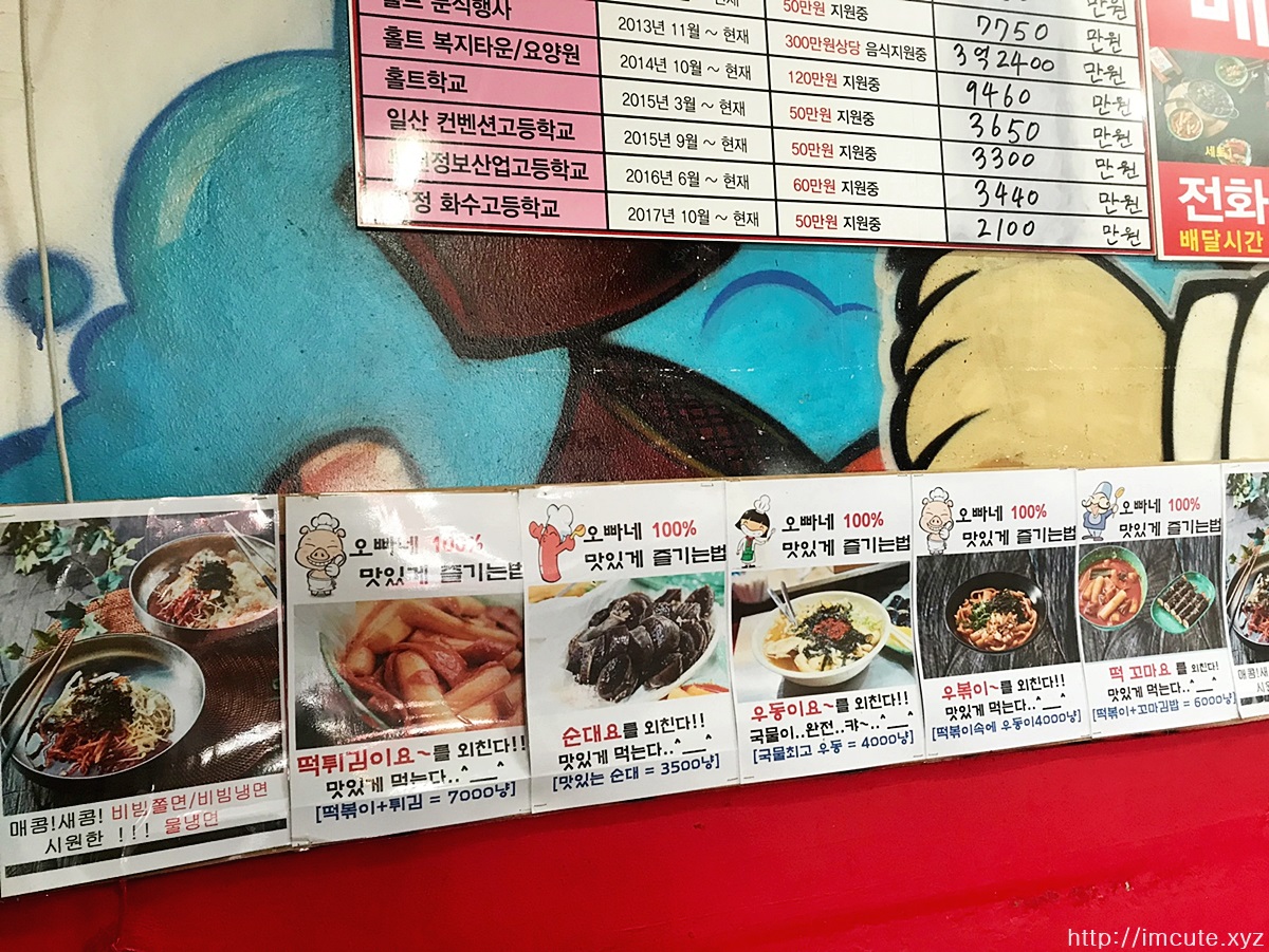 김밥이랑 순대는 기본으로 있고요 면메뉴로 비빔쫄면/비빔냉면/물냉면도 팔고있고 우동에 우볶이까지 있다니요~~~