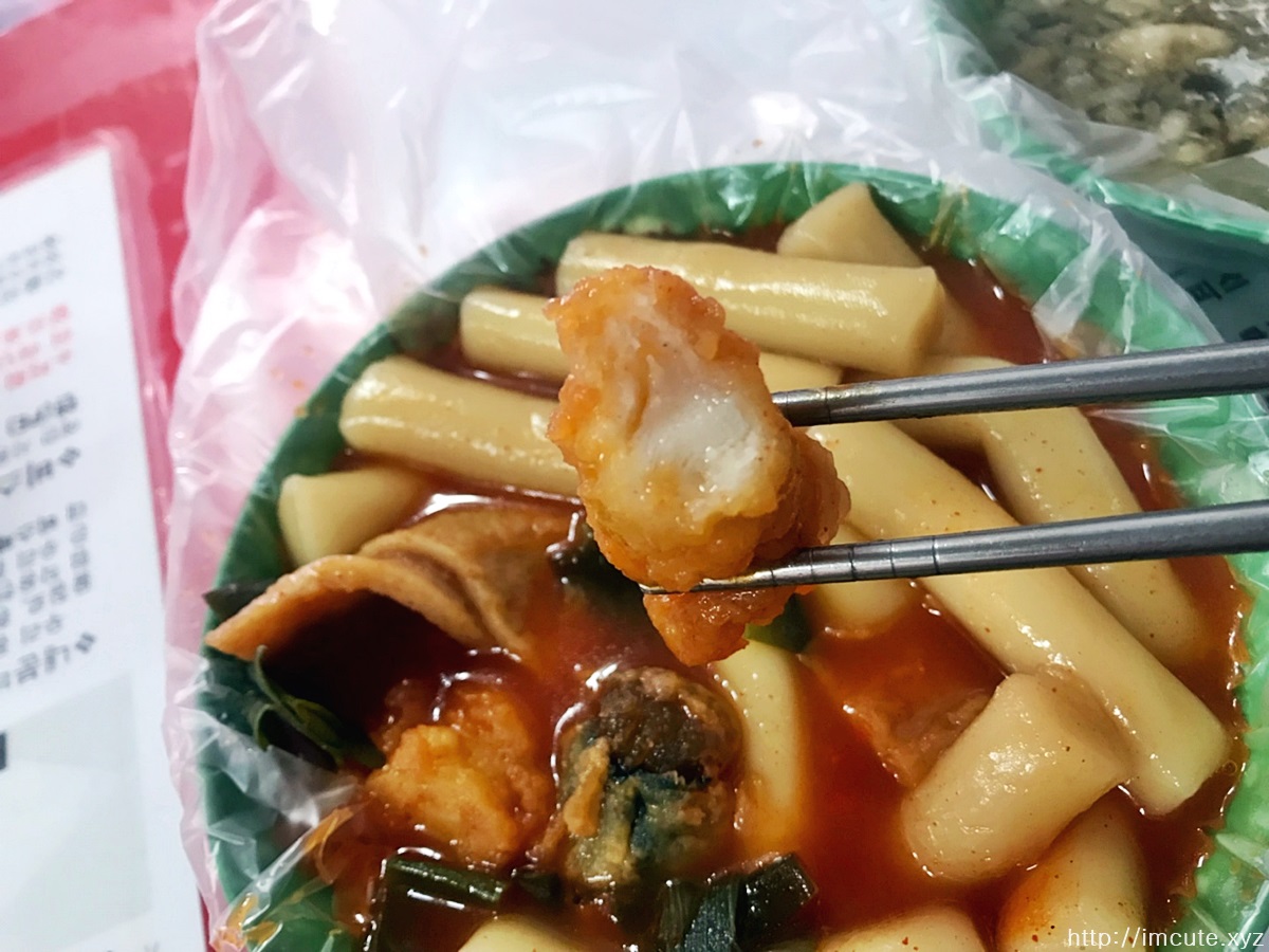 그리고 숟가락과 젓가락을 주시는데 감히 이쑤시개로는 먹지 못할 범접하지 못할 빅사이즈 떡이라는 사실. 오뎅도 함뿍 들어있습니다. 튀김은 범벅으로 해달라고 요청해서 이렇게 주셨어요. 그럼 잘 먹겠습니다.