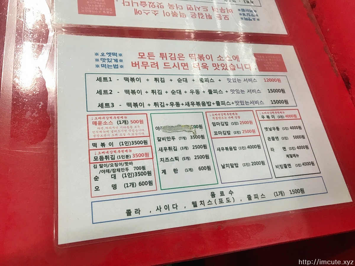일산 신촌 오빠네 옛날 떡볶이 가격표입니다.