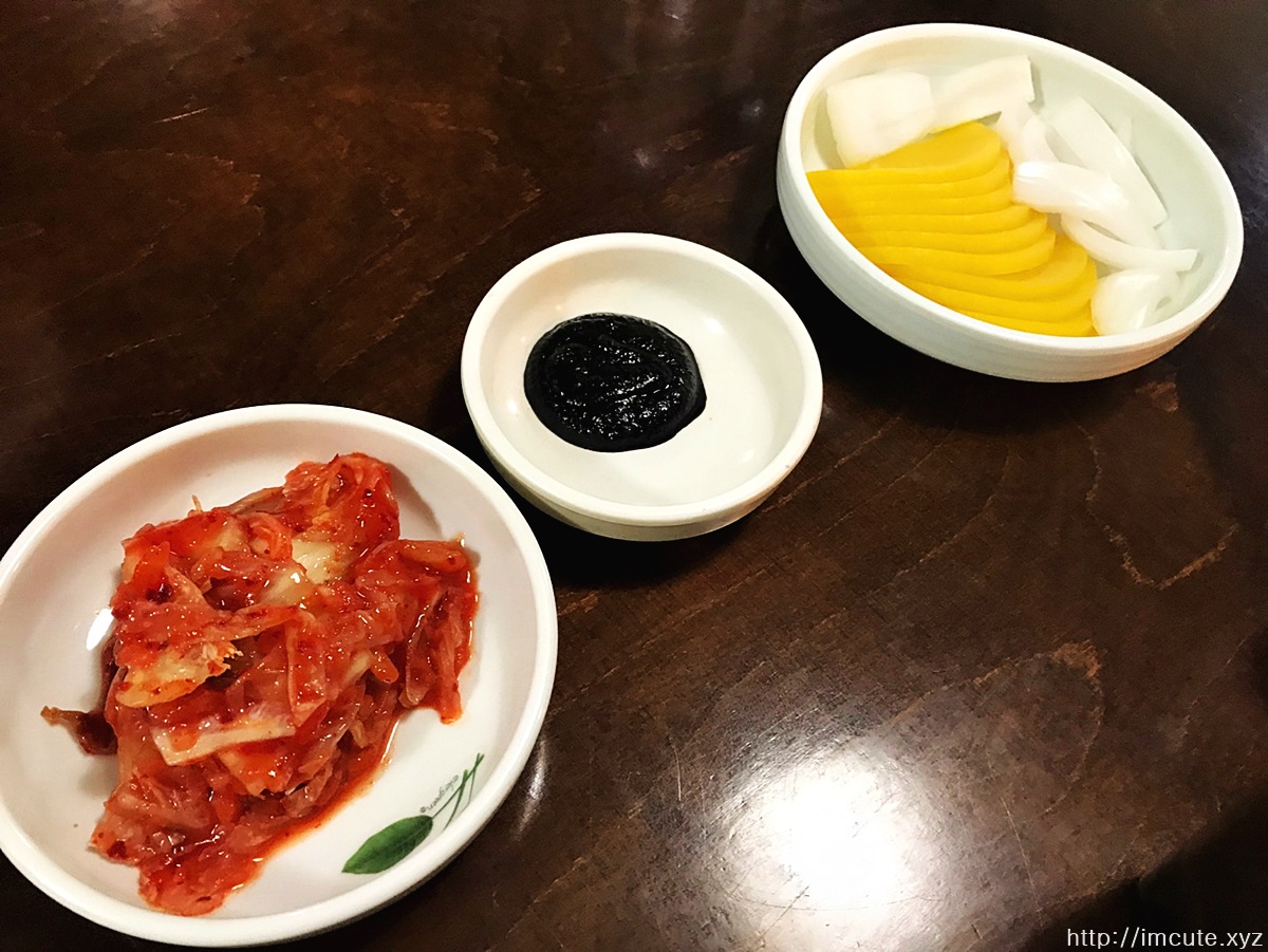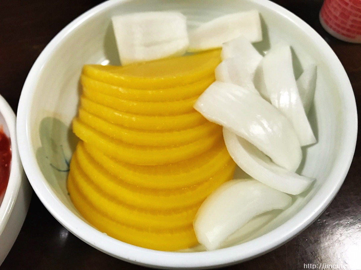 밑반찬으로는 김치, 춘장, 그리고 단무지와 생양파가 나옵니다.