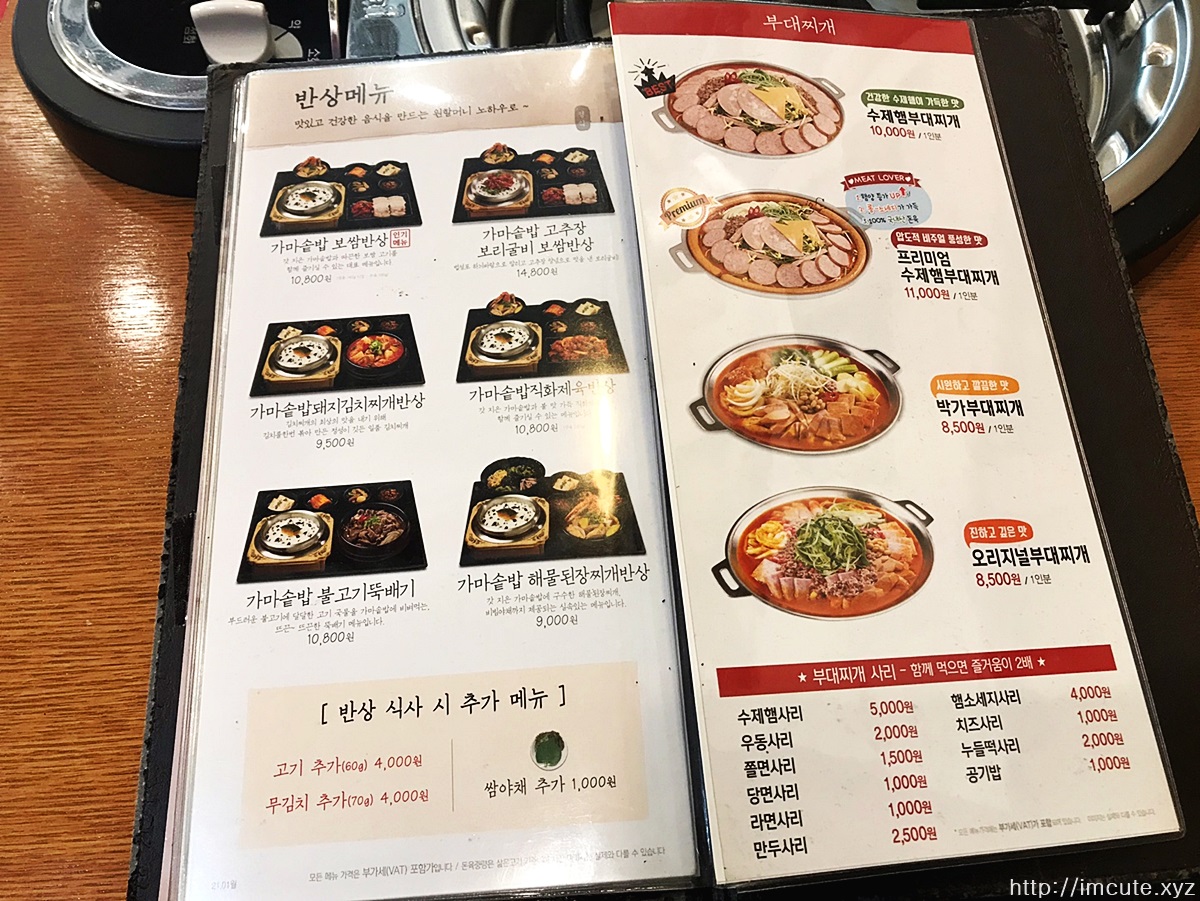 저는 반상메뉴만 찍어왔습니다. 반상메뉴로는 가마솥밥 보쌈반상, 가마솥밥 고추장 보리굴비 보쌈반상, 가마솥밥 돼지김치찌개 반상, 가마솥밥 직화 제육반상, 가마솥밥 불고기 뚝배기, 가마솥밥 해물된장찌개반상 이렇게 있고요. 반상 식사시 추가메뉴로는 고기추가 4000원, 무김치 추가 4000원, 쌈야채 추가 천원이더라구요.