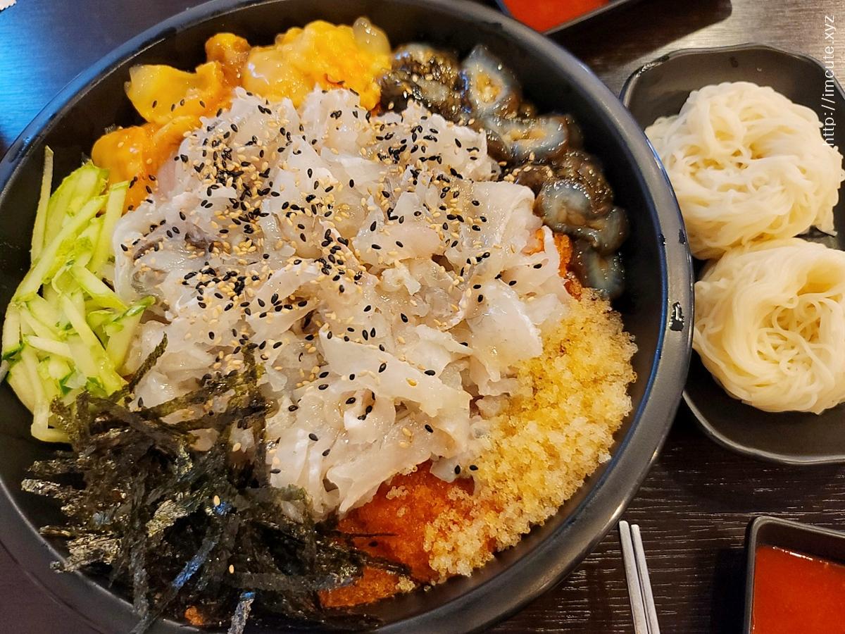 물회 잘 먹었다고 소문 나려면, 소면 국물에 퐁당 넣어서 면치기하듯 먹어야 제맛이죠