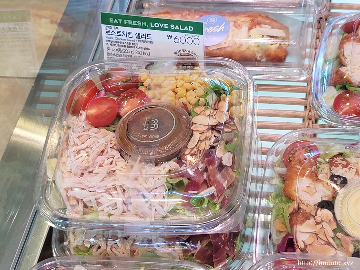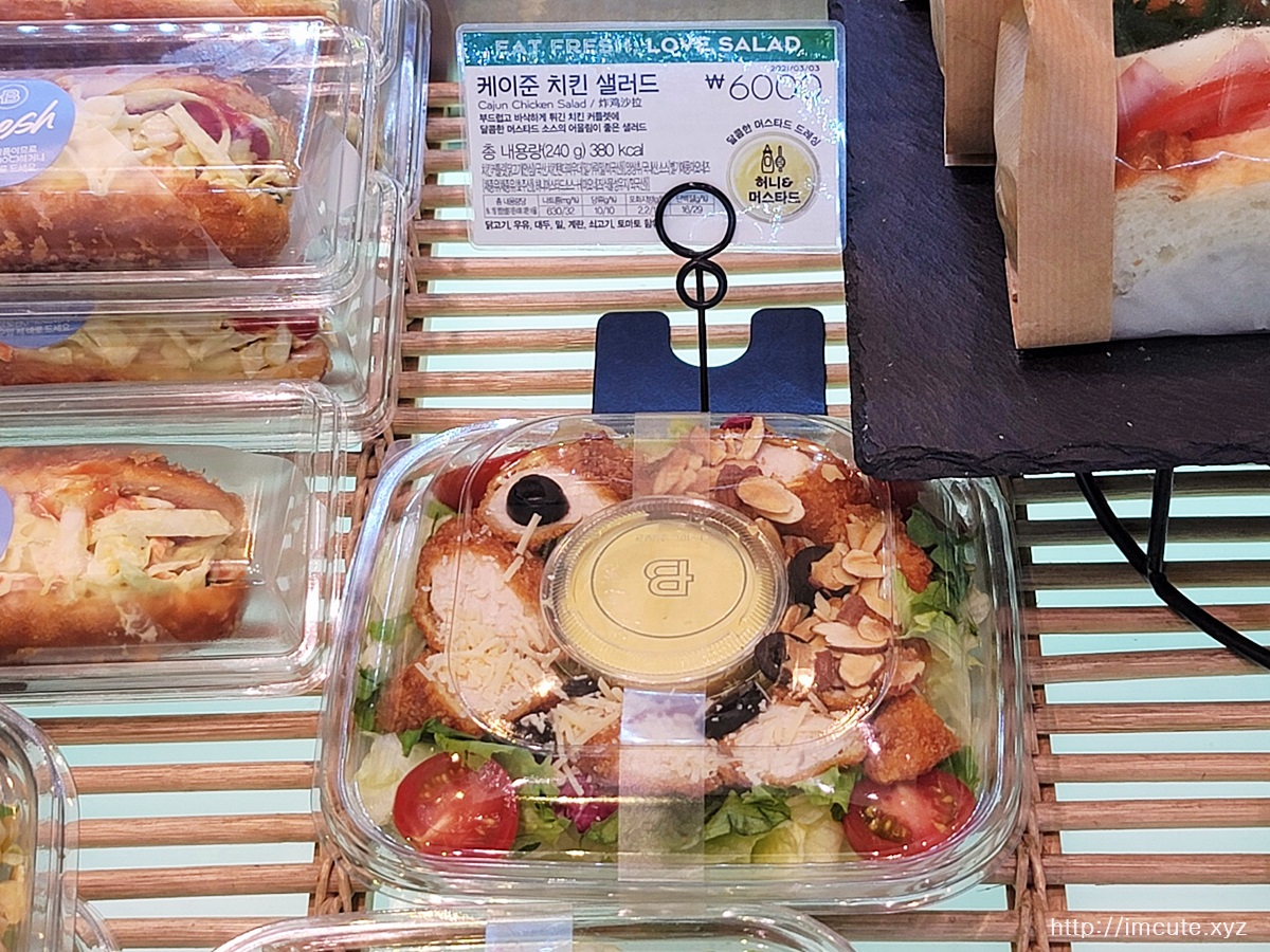 케이준 치킨샐러드와 로스트치킨 샐러드는 샌드위치가 부담스러울때 먹으면 좋을것 같고요 가격은 각각 6000원입니다.