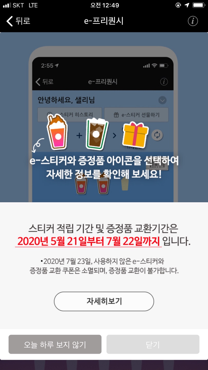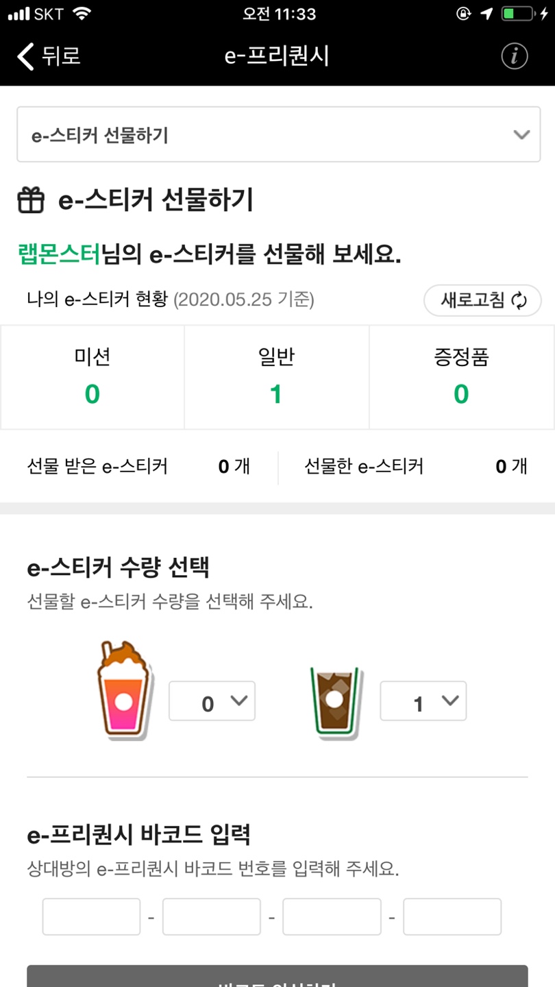 e-쿠폰 발행하기 메뉴에서 탭을 바꾸면 e-스티커 선물하기가 나온다. 여기서 내가 가지고 있는 스티커가 무엇인지, 프로모션에 필요한 스티커는 얼마나 더 모아야 하는지 확인 가능하다.