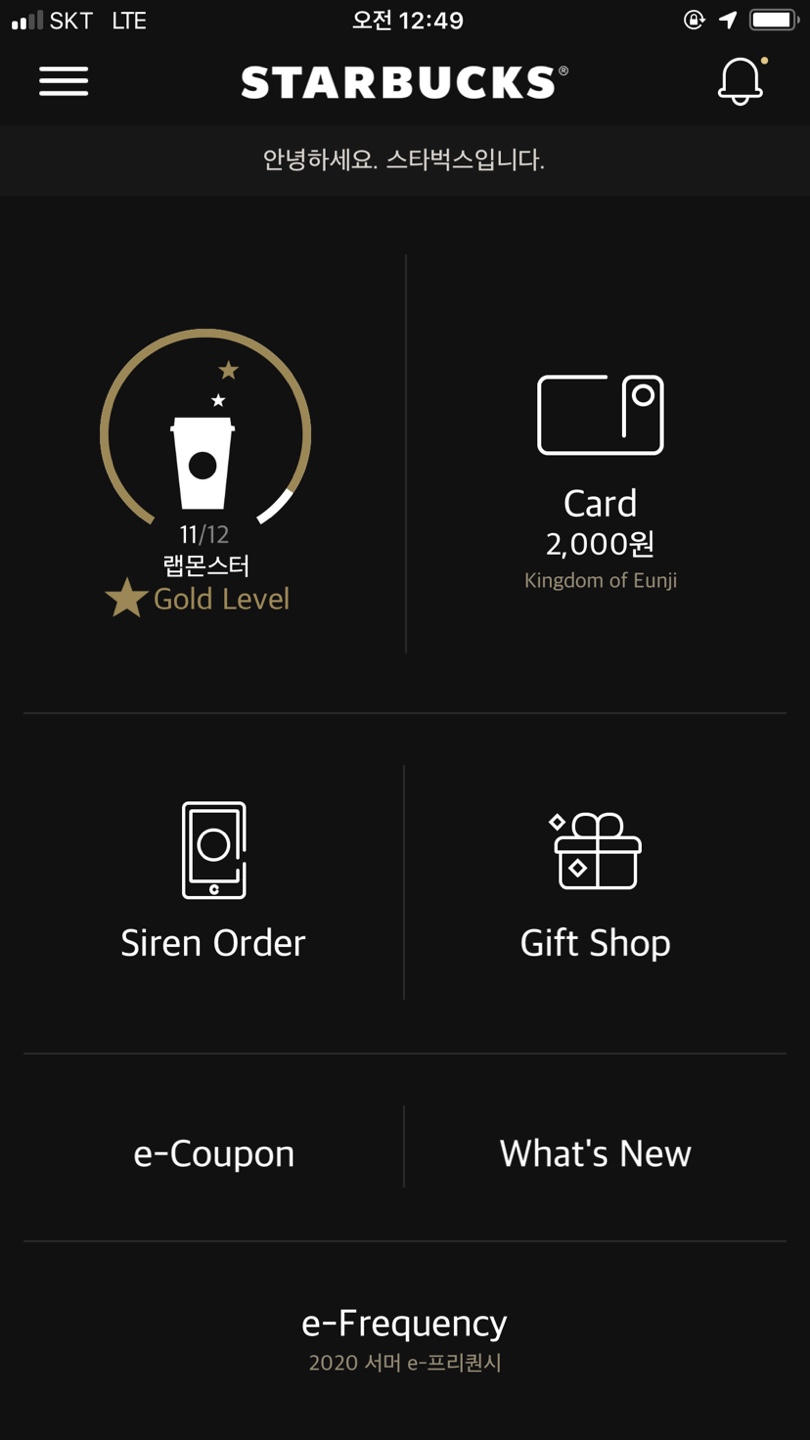 어플에 들어간 화면이다. 나는 골드회원이길래 ★ Gold Level이라고 딱 써있다. 골드 레벨이라는 것은 그리 어렵지 않다~ 나같은 커피 매니아에게 말이다. 카드잔액과 사이렌오더, 기프트 샵, 이쿠폰, 이달의 프로모션 진행화면을 알 수 있는 What's New메뉴가 보인다.