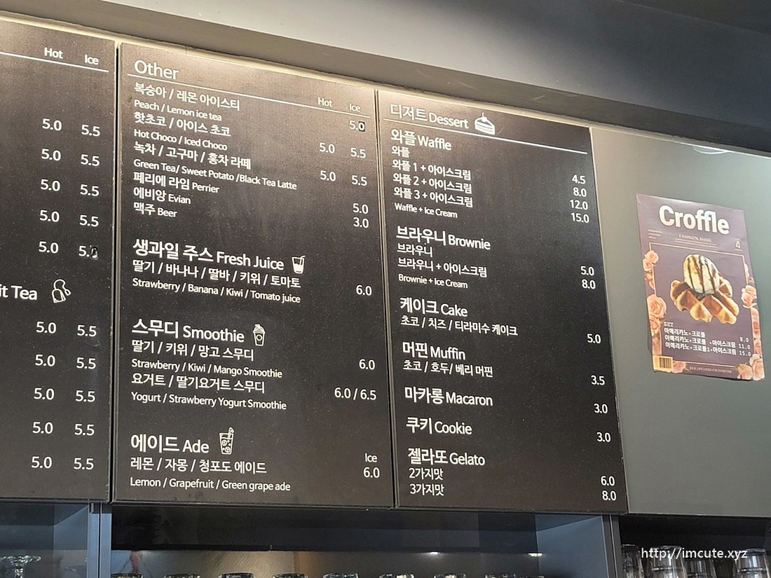 커피/티/스무디/생과일주스/에이드/아이스티/디저트등이 있습니다
