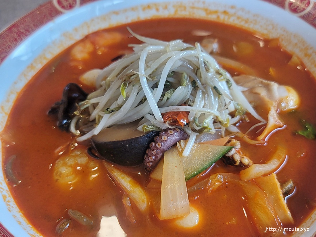 숙주가 따로 삶아져서 얹어진 짬뽕인데요 그래서 그런지 국물이 굉장히 맑고, 청아하다는 느낌까지 받습니다. 그렇게 맵진 않아요.
