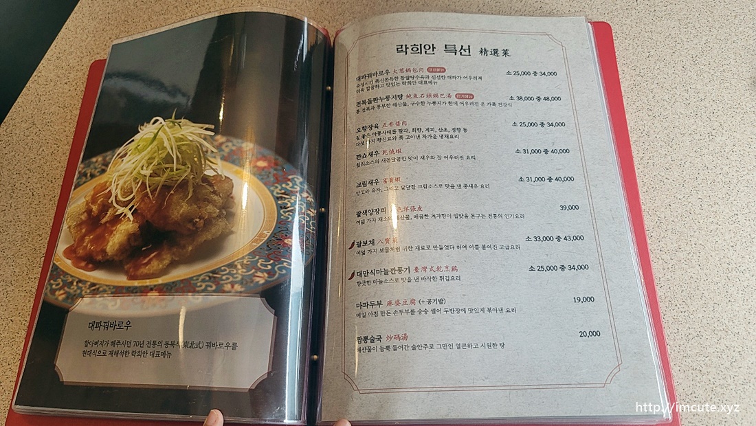 대파꿔바로우, 전복돌판누룽지탕, 깐쇼새우, 팔색양장피, 팔보채, 대만식마늘깐풍기, 마파두부, 짬뽕술국이 있습니다.