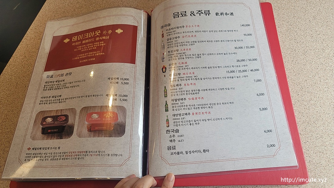 음료와 주류 메뉴인데요 화교의 손맛이랑 과연 어울릴것 같은 메뉴들이네요. 고량주와 연태고량주, 청도맥주, 하얼빈맥주, 대만망고맥주도 있고 한국술로 소주 맥주도 있고 음료도 있습니다.