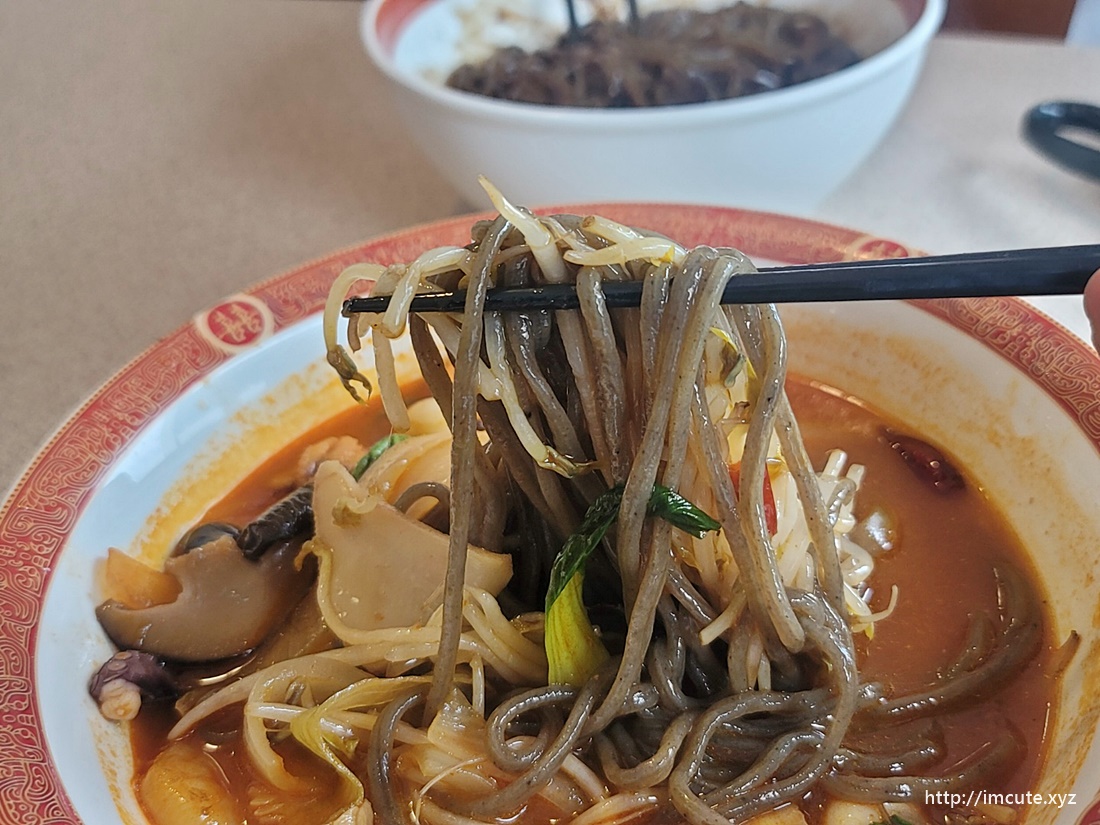 숙주가 따로 삶아져서 얹어진 짬뽕인데요 그래서 그런지 국물이 굉장히 맑고, 청아하다는 느낌까지 받습니다. 그렇게 맵진 않아요.