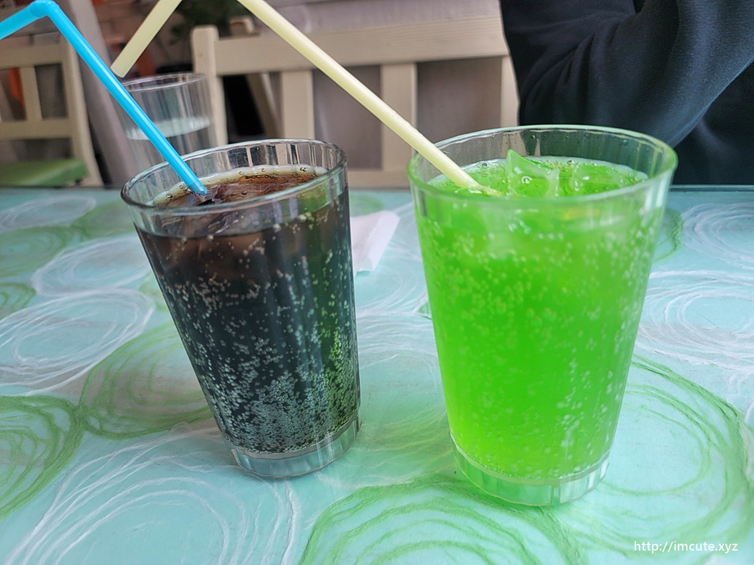 음료는 메론소다가 아니라.... 저거 마운틴 듀랑 콜라에요.