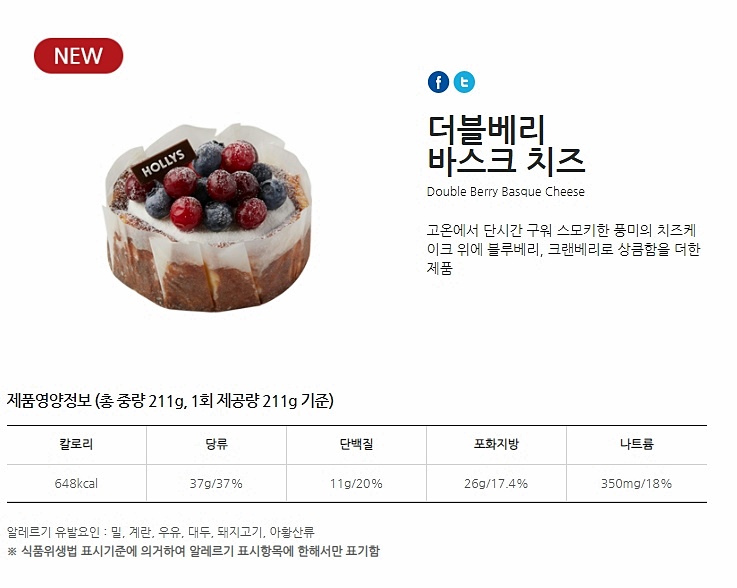 더블베리 바스크 치즈 케이크는 칼로리가 648kcal이랍니다. 당류도 들어있고 들어 있는 단백질은 11g이며 포화지방은 26g, 나트륨은 350mg이라고 하네요