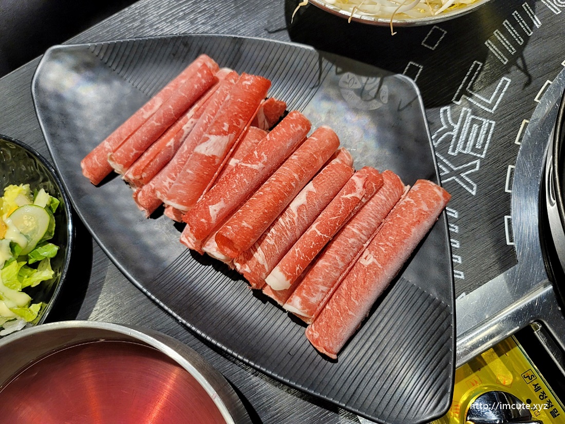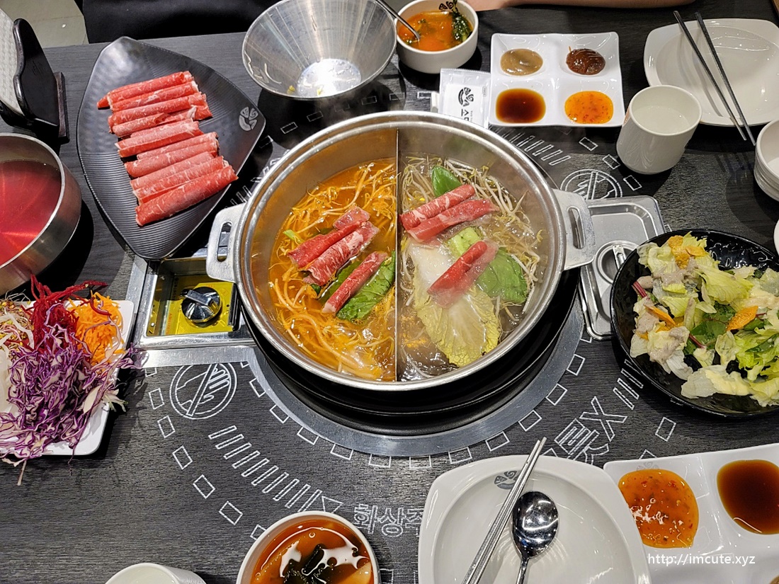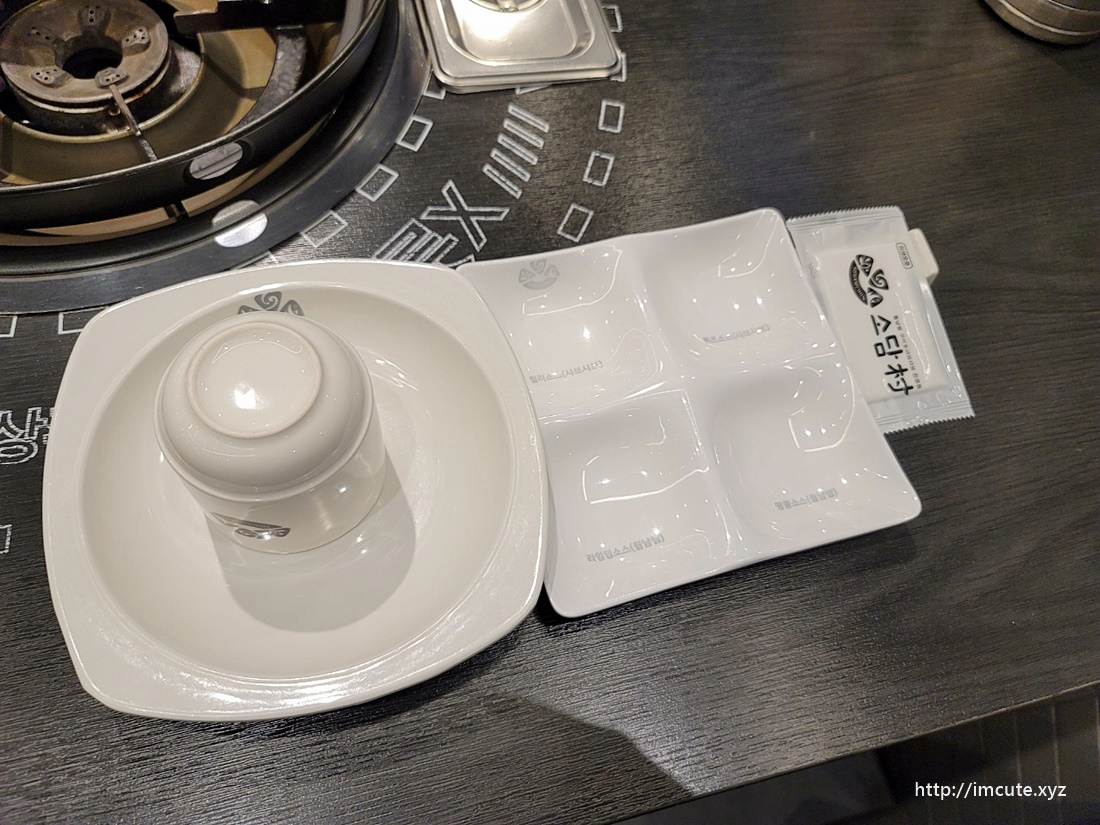 매운 육수용 다대기와 샤브육수통 순한맛.. 우리 테이블은 반반으로 시켜서 국물은 2가지였고요
