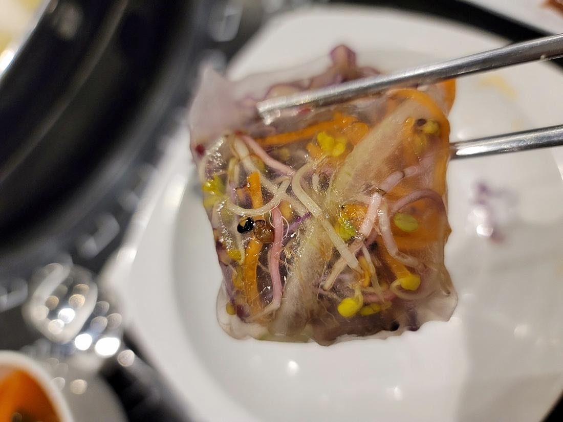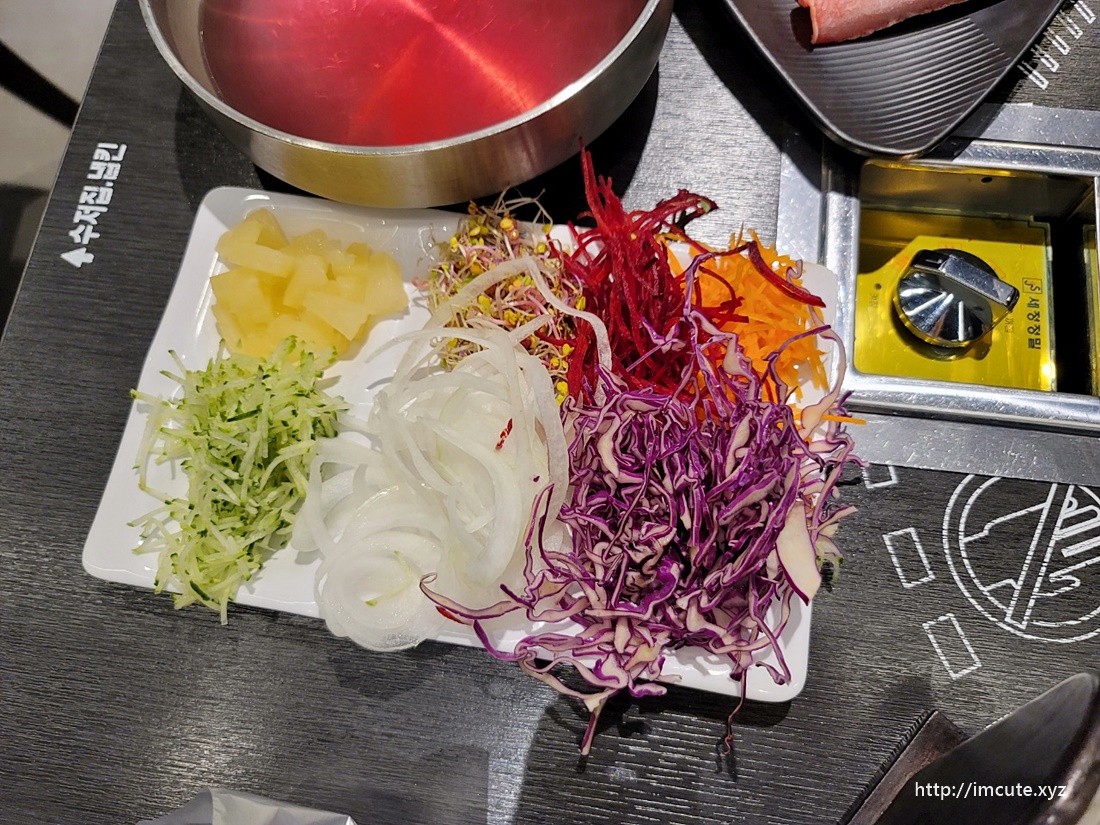 여러가지 야채를 떠왔는데요 바닥에 무슨 야채를 퍼야 하는지 알려주셔서 손쉽게 야채를 떠 올 수 있었습니다