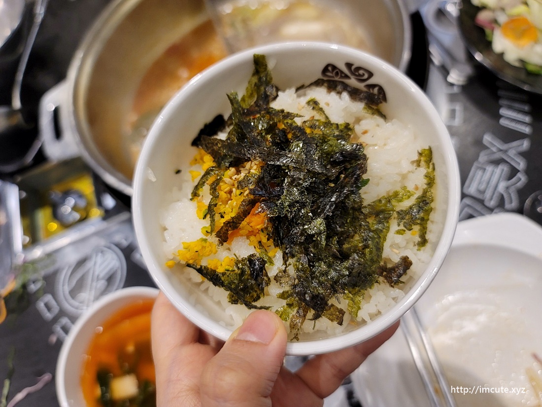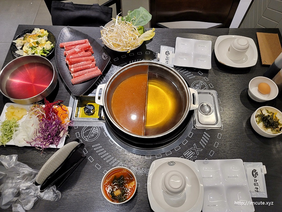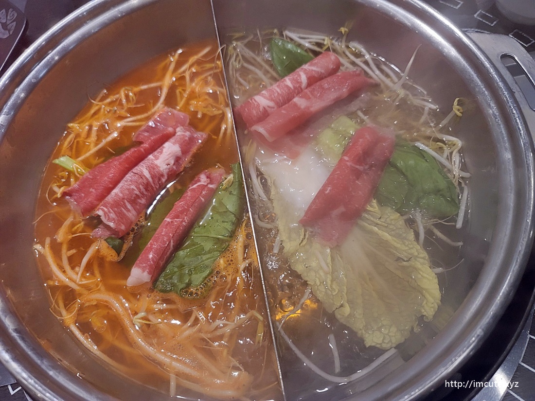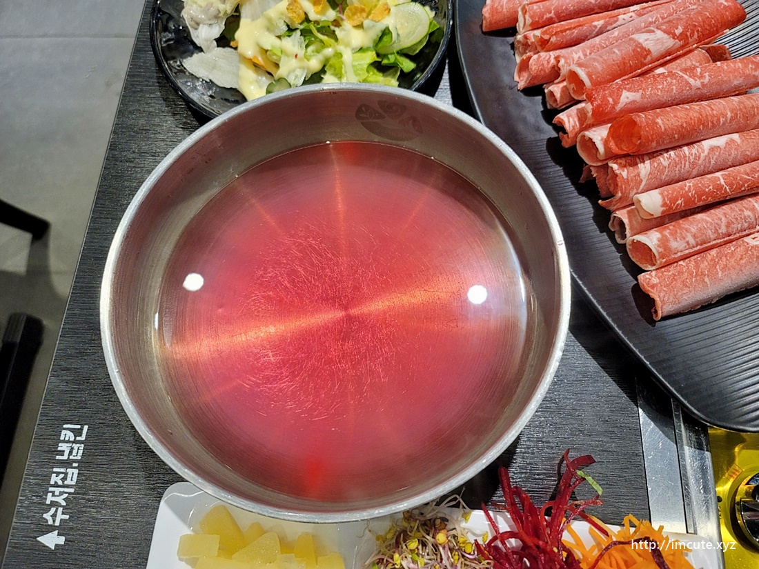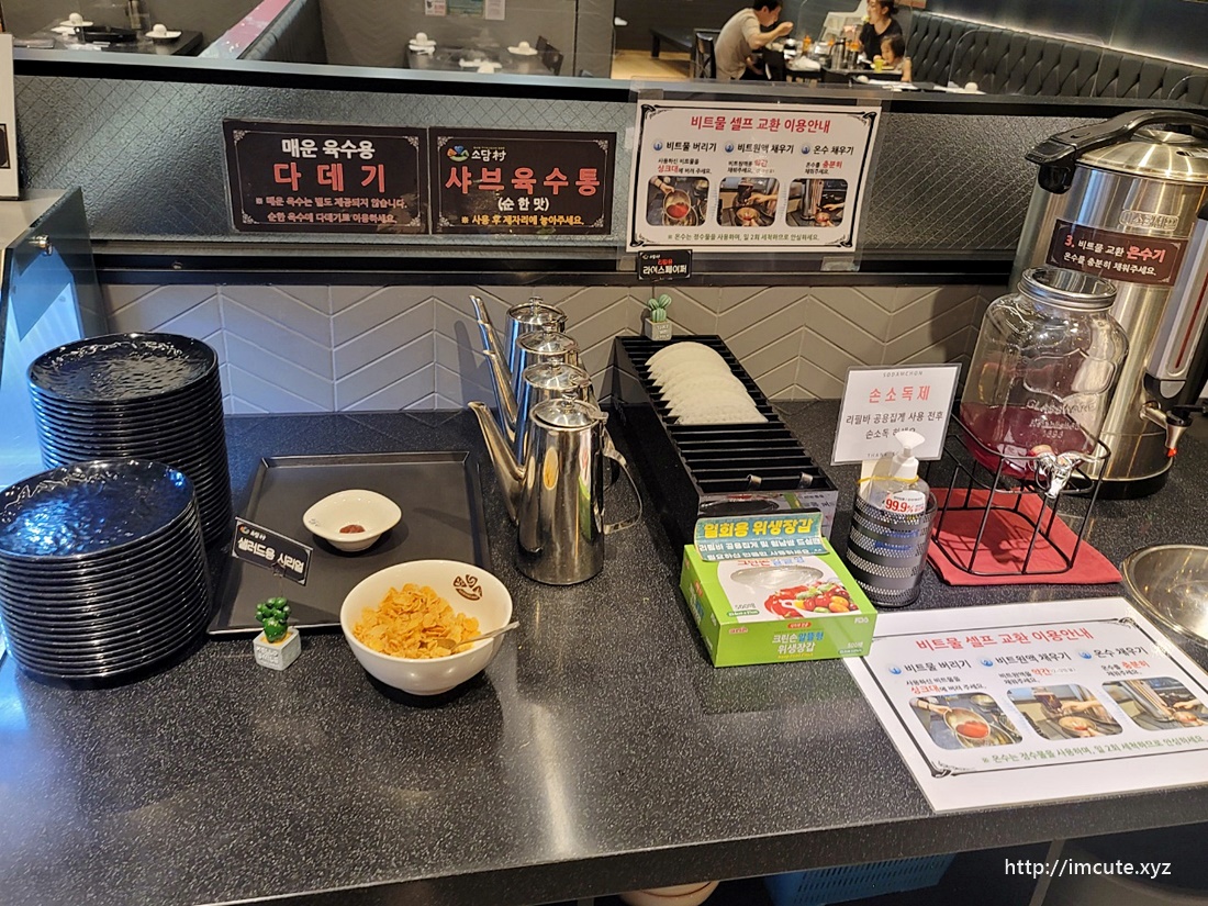 매운 육수용 다대기와 샤브육수통 순한맛.. 우리 테이블은 반반으로 시켜서 국물은 2가지였고요