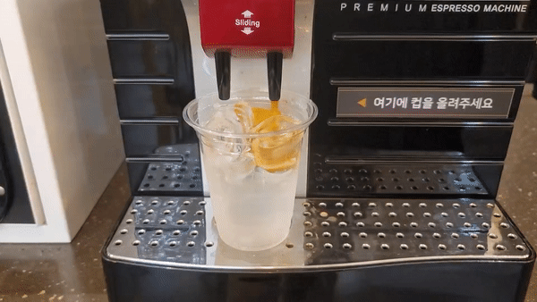 얼음 가득 물 조금 넣어주고 커피를 뽑아내었어요. 가만 있으면 색이 더 진해져요