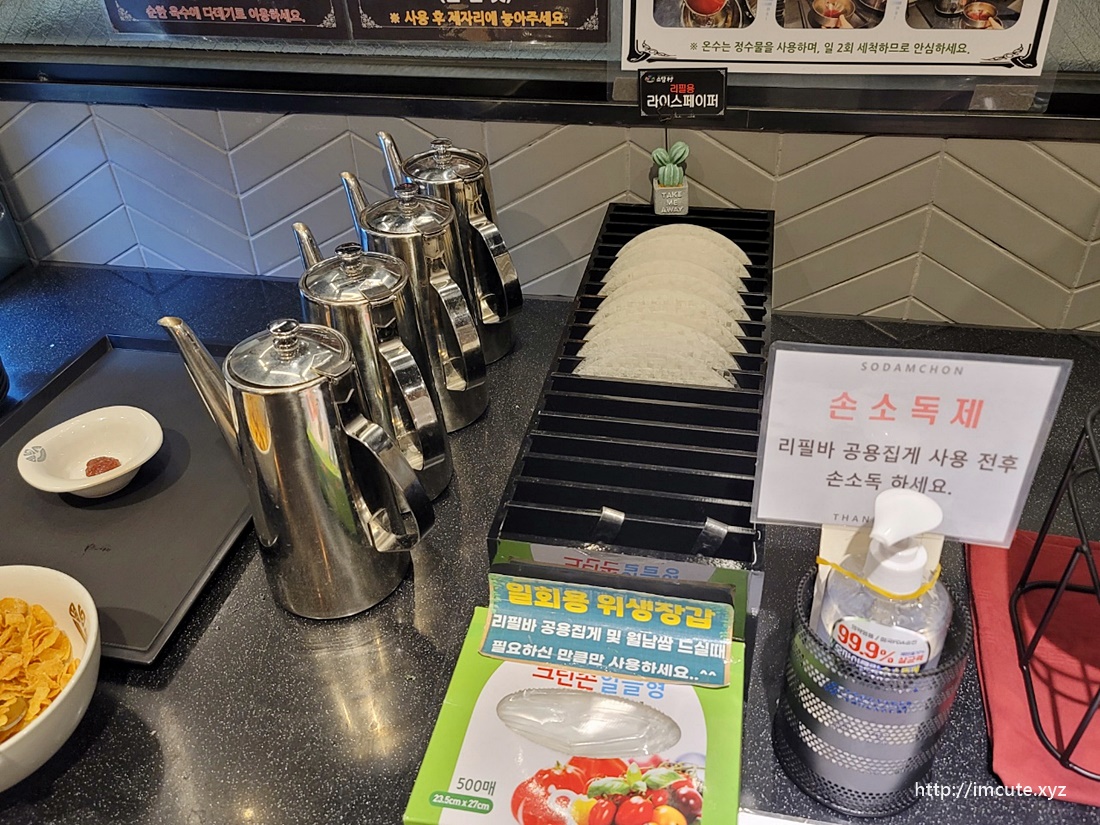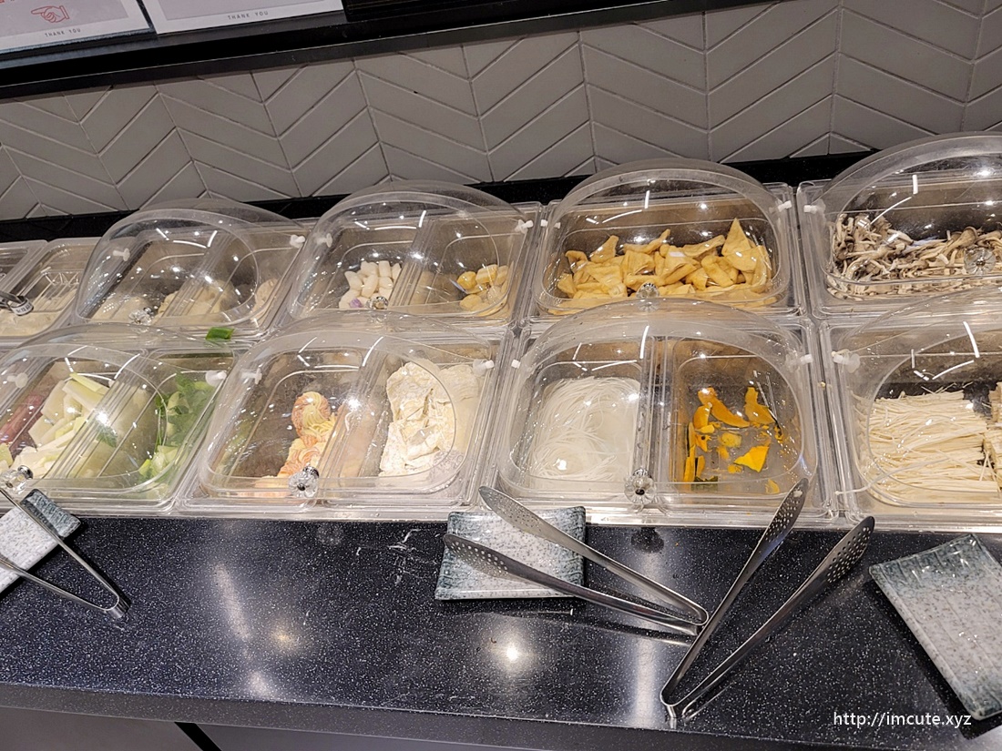 야채와 건더기 셀프 코너입니다. 애호박부터 시작해서 숙주, 팽이버섯, 유부, 청경채, 오뎅등 여러가지 야채와 건더기가 있습니다