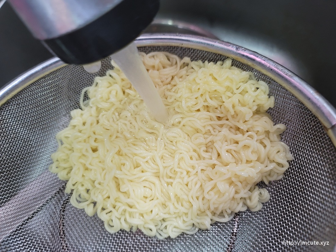 이쯤 되면 얼추 다 익었으니 체에 받쳐줍니다.