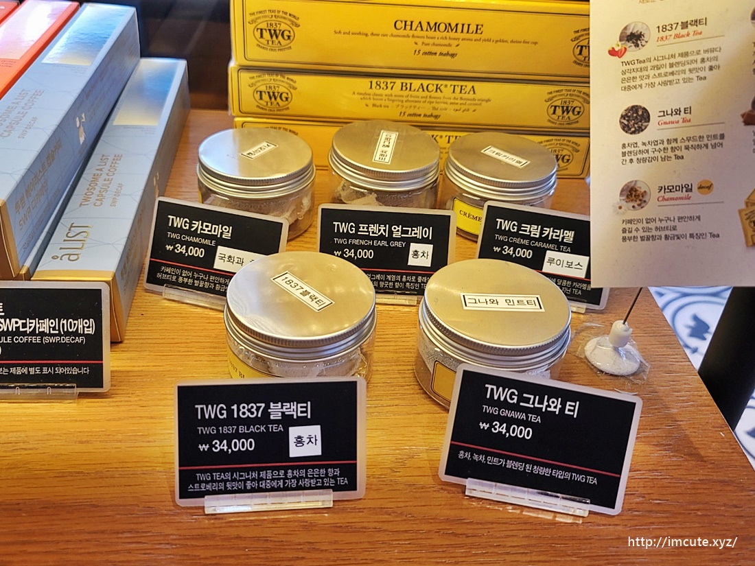 TWG 카모마일, 프렌치 얼그레이, 크림 카라멜, 1837블랙티, 그나와 티 가 있으며 가격은 각각 34000원이므로 홍차 매니아님들이 주목하시면 좋겠습니다. TWG TEA의 시그니처 제품이 바로 1837블랙티라고 하며 TWG그나와 티는 홍차, 녹차, 민트가 블렌딩 되었다고 합니다.