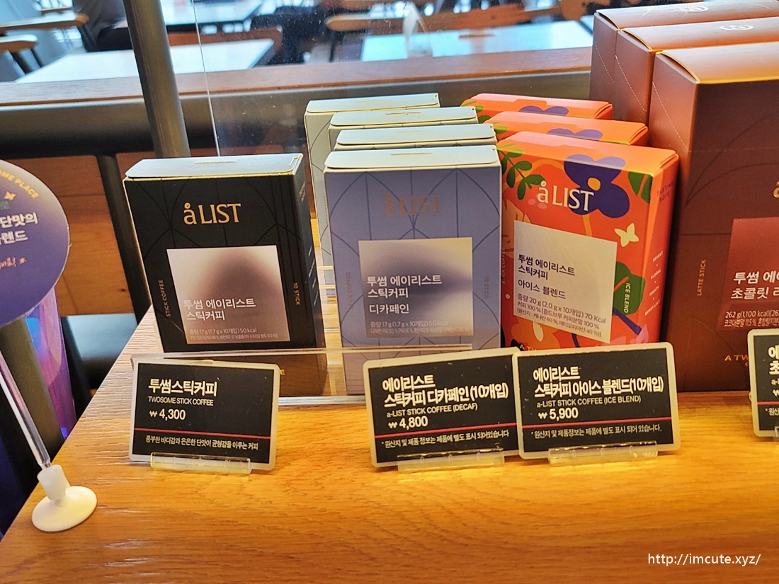 투썸스틱커피 가격은 4300원, 에이리스트 스틱커피 디카페인 10개입 가격은 4800원, 에이리스트 스틱커피 아이스 블렌드는 10개입에 5900원입니다.