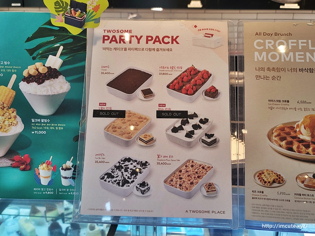 투썸 파티팩은 떠먹는 케익을 즐길 수 있는 구성입니다. 가격은 35400원이며 티라미수, 스트로베리 초콜릿 생크림, 아이스박스, 딸기 레어 치즈맛이 있습니다.