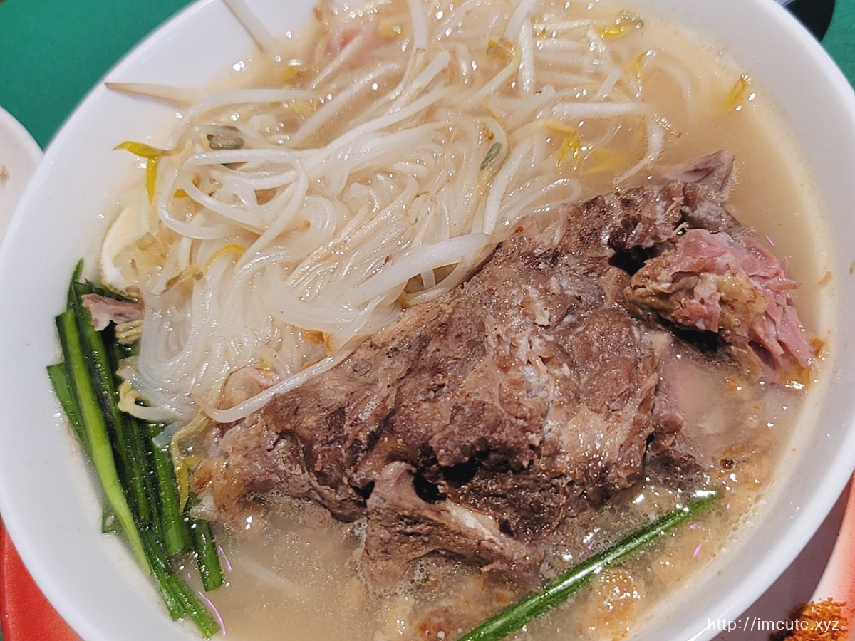 등뼈가 하나 통으로 들어있는 쌀국수는 양꼬치 찍어먹을때 소스인지, 시치미인지 모를 현지소스가 같이 놓여져 있어서 같이 먹었어요