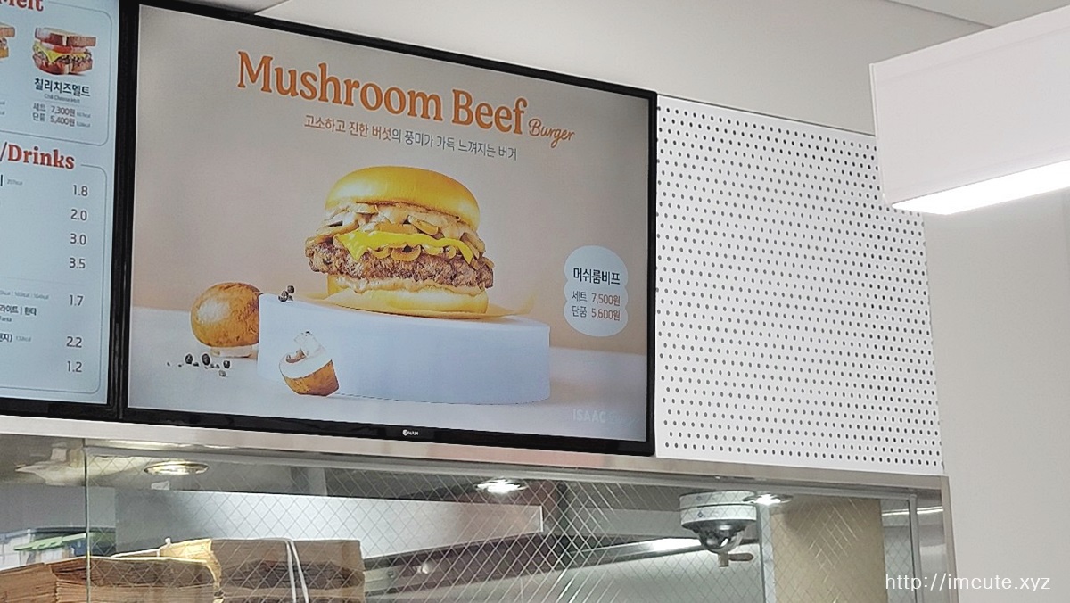 먼저 이삭시그니쳐 세트는 7800원이고 단품은 6000원입니다. 이삭버거 클래식은 세트 7800원, 단품 6000원이며 머쉬룸비프는 세트 7500원, 단품은 5600원입니다.