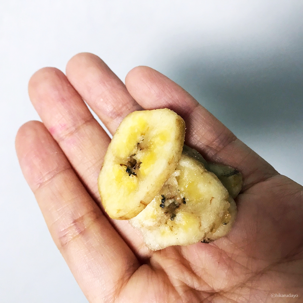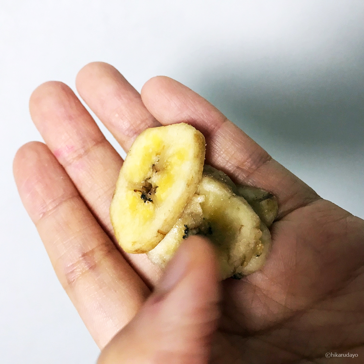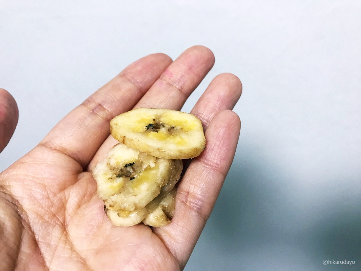 손에 토옥 하고 필리핀 바나나칩 몇덩이 올려놔 보았습니다. 정말로 통으로 잘 만든 거 같아요. 바나나칩을 얇게 저며 놓은 것도 괜찮던데, 그거 이름이 무엇이더라.. 아무튼 장사의신것도 아주 좋네요. 믿을 신짜 그대로 느끼며 구매하길 아주 잘 했네요.