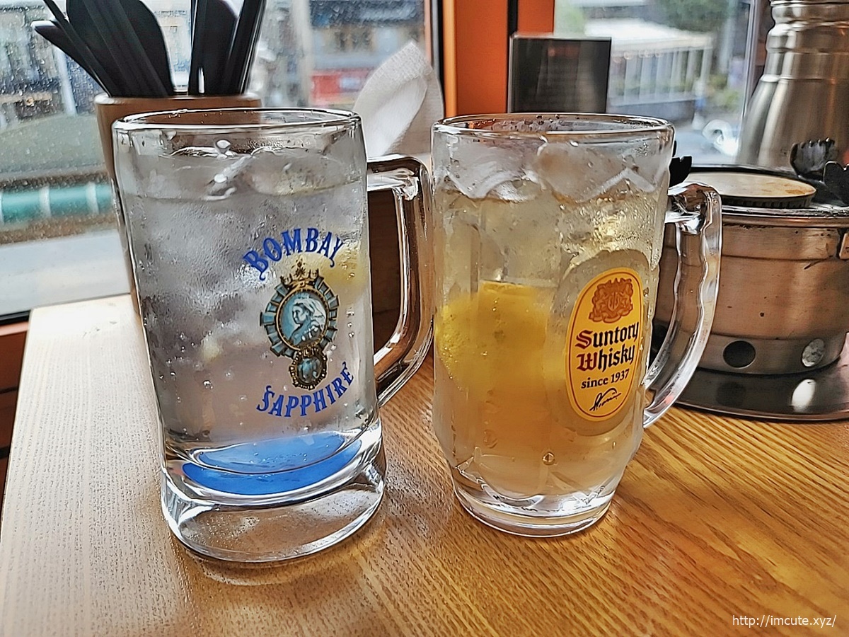 왼은 봄베이, 오른족은 산토리 위스키가 들어간 하이볼입니다. 처음에는 아예 봄베이가 파란 색인가 했더니 바닥을 파랗게 해 놓아서 착시현상이 있더라고요. 하지만 그래서인지 더 시원해보이죠. 저는 언제 먹어도 산토리 위스키가 넘 맛있는거 같아요!! 이렇게 두개 시켰네요.