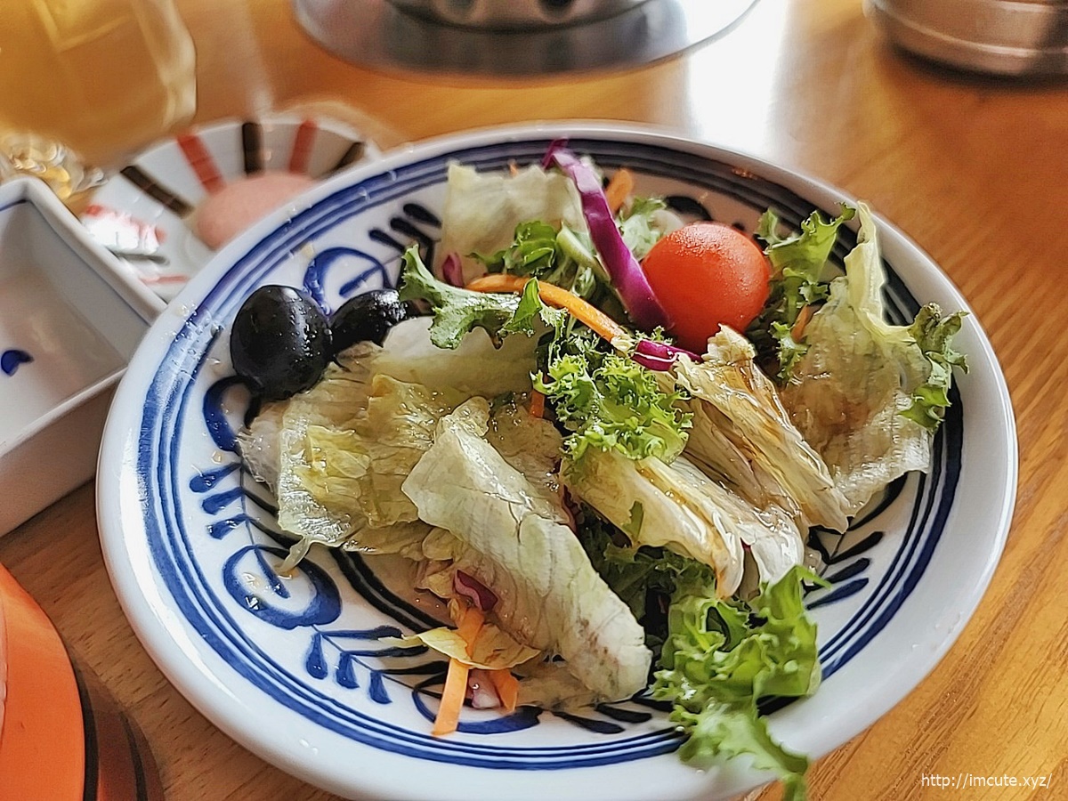 샐러드는 첨부터 양을 많이 주셔서 좋았어요. 제가 야채를 좋아하는데 아무래도 덮밥 안에 들어있는 양파만으로는 부족하다고 생각했거든요. 아삭아삭한 신선한 야채에 채썬 당근이 들어있고 올리브 두알까지 깨알~ 게다가 방울토마토로 마지막 화룡점정을 찍어주네요. 그릇도 조화롭고 참 예뻤어요. 저도 이런 플레이팅에 도전해봐야겠네요!