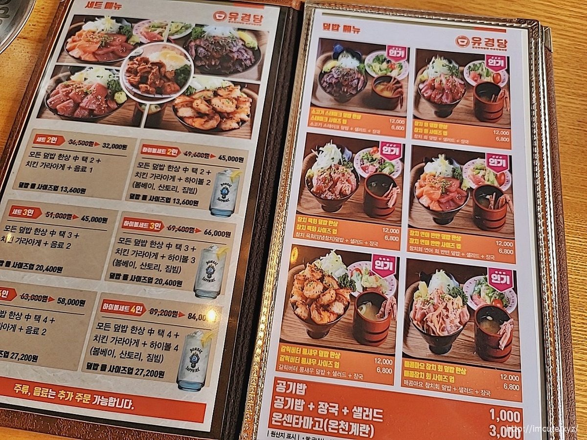 소고기 스테이크 덮밥과 참피 육회 덮밥, 갈릭버터 통새우 덮밥, 참치 연어 반반 등, 아주 여러가지 재료가 가득가득 올라간 덮밥 메뉴또한 확인할 수가 있었답니다.
