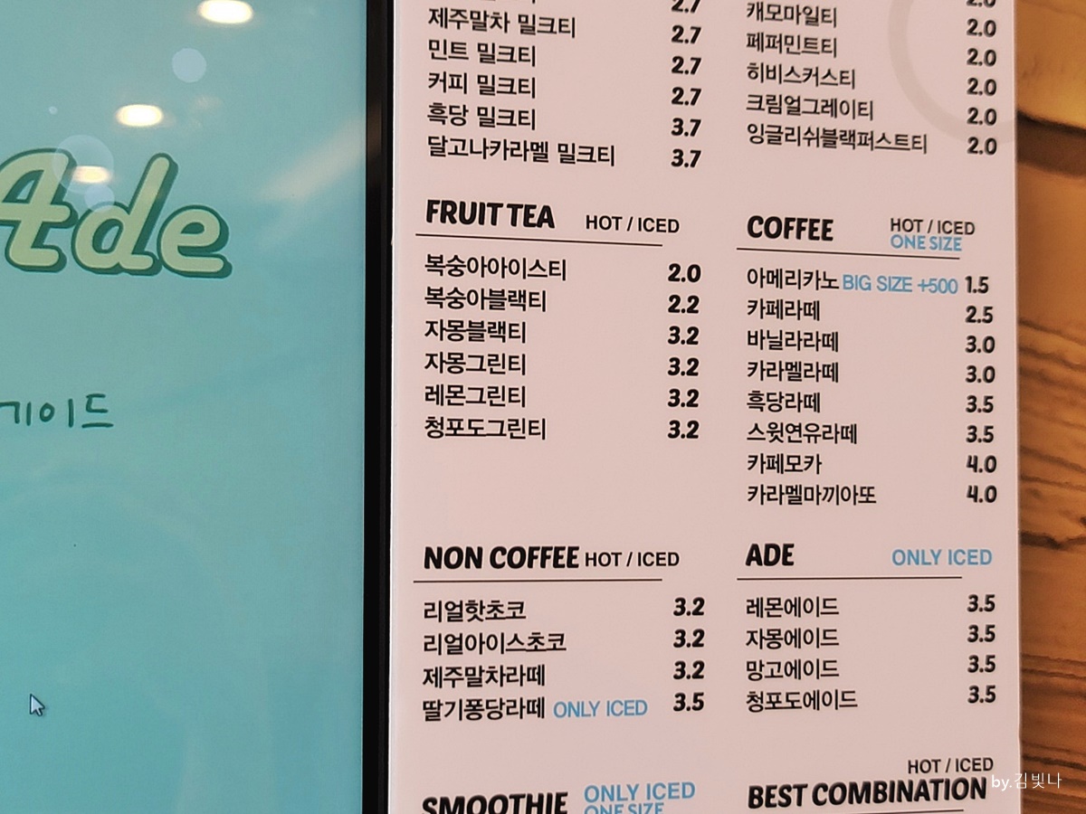 에이드는 레몬과 자몽, 망고와 청포도가 있고요 가격은 모두 3500원입니다.