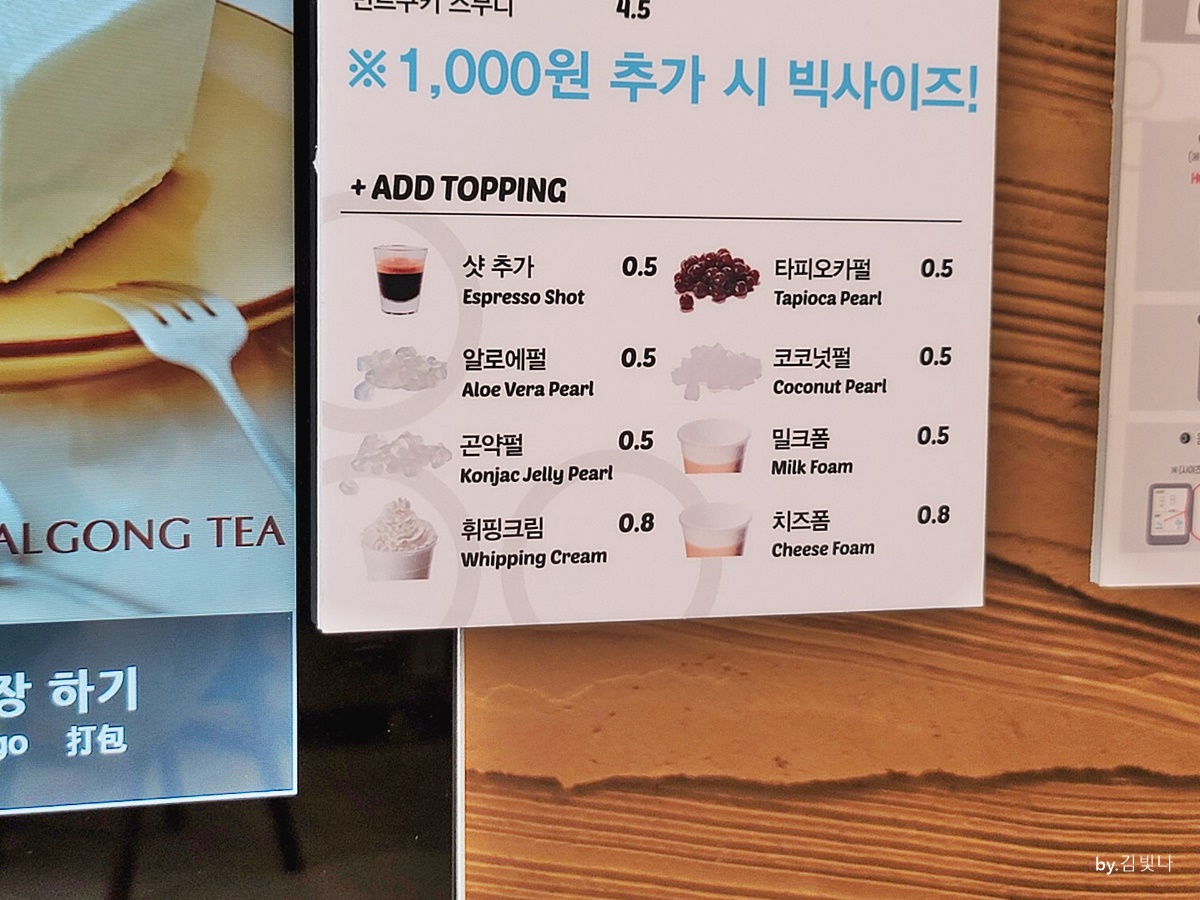 게다가 팔공티는 버블티 전문점이니 샷추가와 타피오카펄, 알로에펄, 코코넛펄, 곤약펄, 밀크폼을 500원에 즐길 수 이쏙요 휘핑크림과 치즈폼은 800원 추가하면 된답니다.