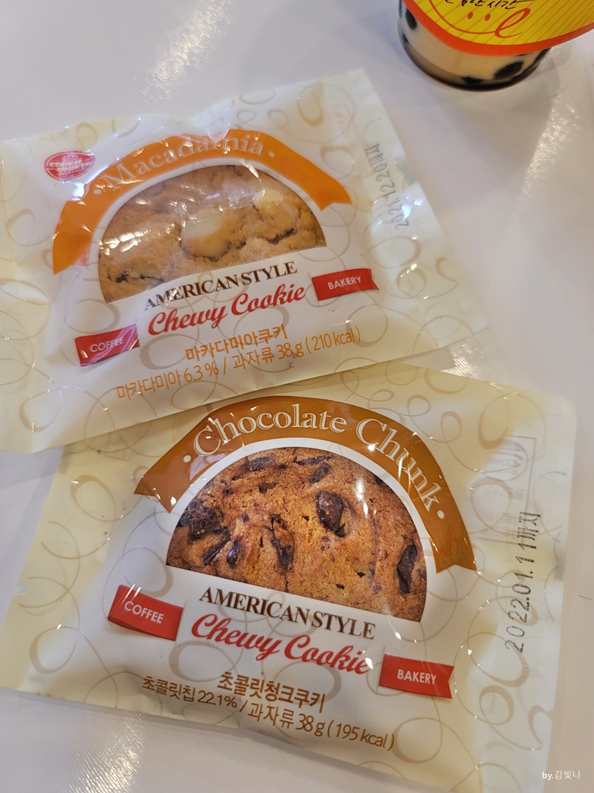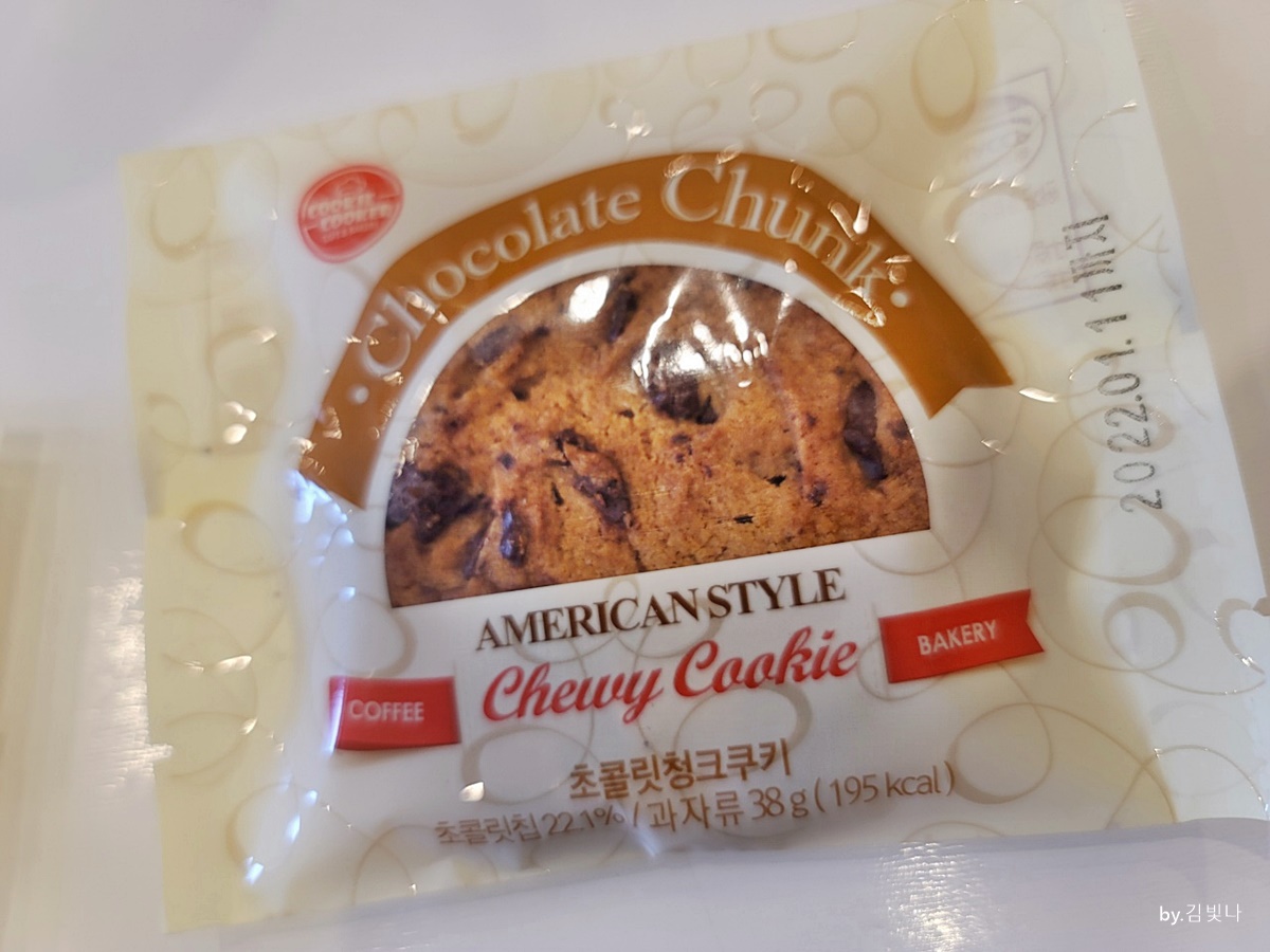 팔공티 쿠키도 같이 먹으면 맛있는 거 같아요. American Style Chewy Cookie인데요 coffee bakery라고 쓰여있는 걸로 봐서 쿠키랑 티랑 같이 즐기면 좋다는 것을 암시하는가 봐요. 초콜릿 청크 쿠키는 초콜릿 칩이 22.1% 들어있고 과자류가 38g이며 195칼로리이니까 2백칼로리 좀 못 미치네요.