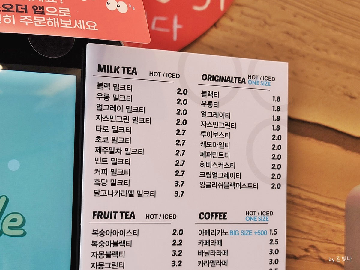 블랙티, 우롱티, 얼그레이티, 자스민그린티는 1800원이었고요 캐모마일티, 페퍼민트티, 히비스커스티, 크림얼그레이티와 잉글리쉬블랙퍼스트티가 2천원입니다.