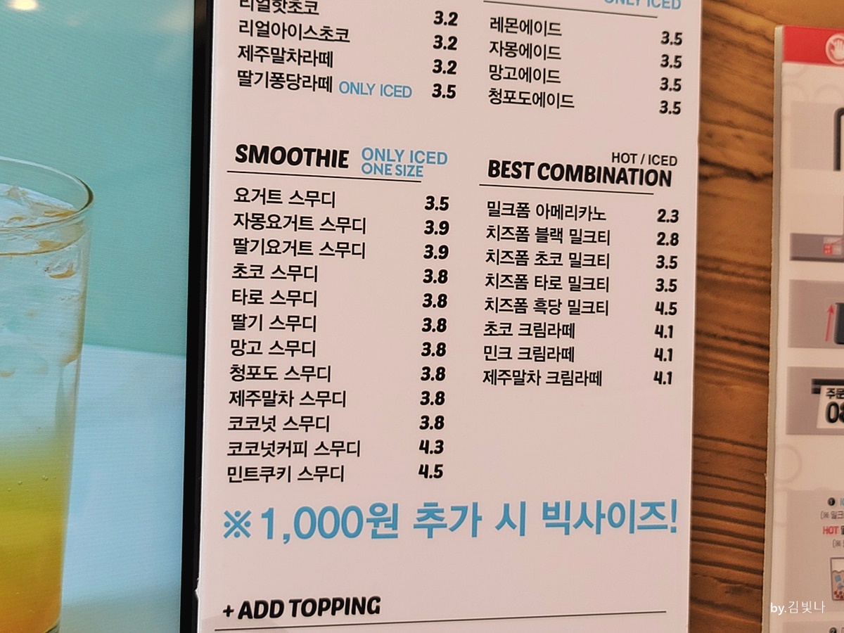 게다가 팔공티는 버블티 전문점이니 샷추가와 타피오카펄, 알로에펄, 코코넛펄, 곤약펄, 밀크폼을 500원에 즐길 수 이쏙요 휘핑크림과 치즈폼은 800원 추가하면 된답니다.