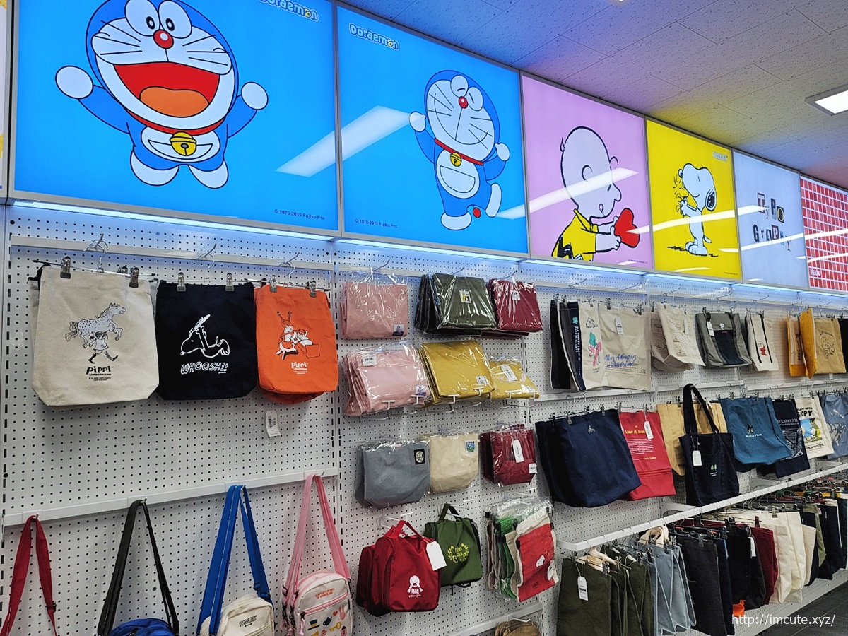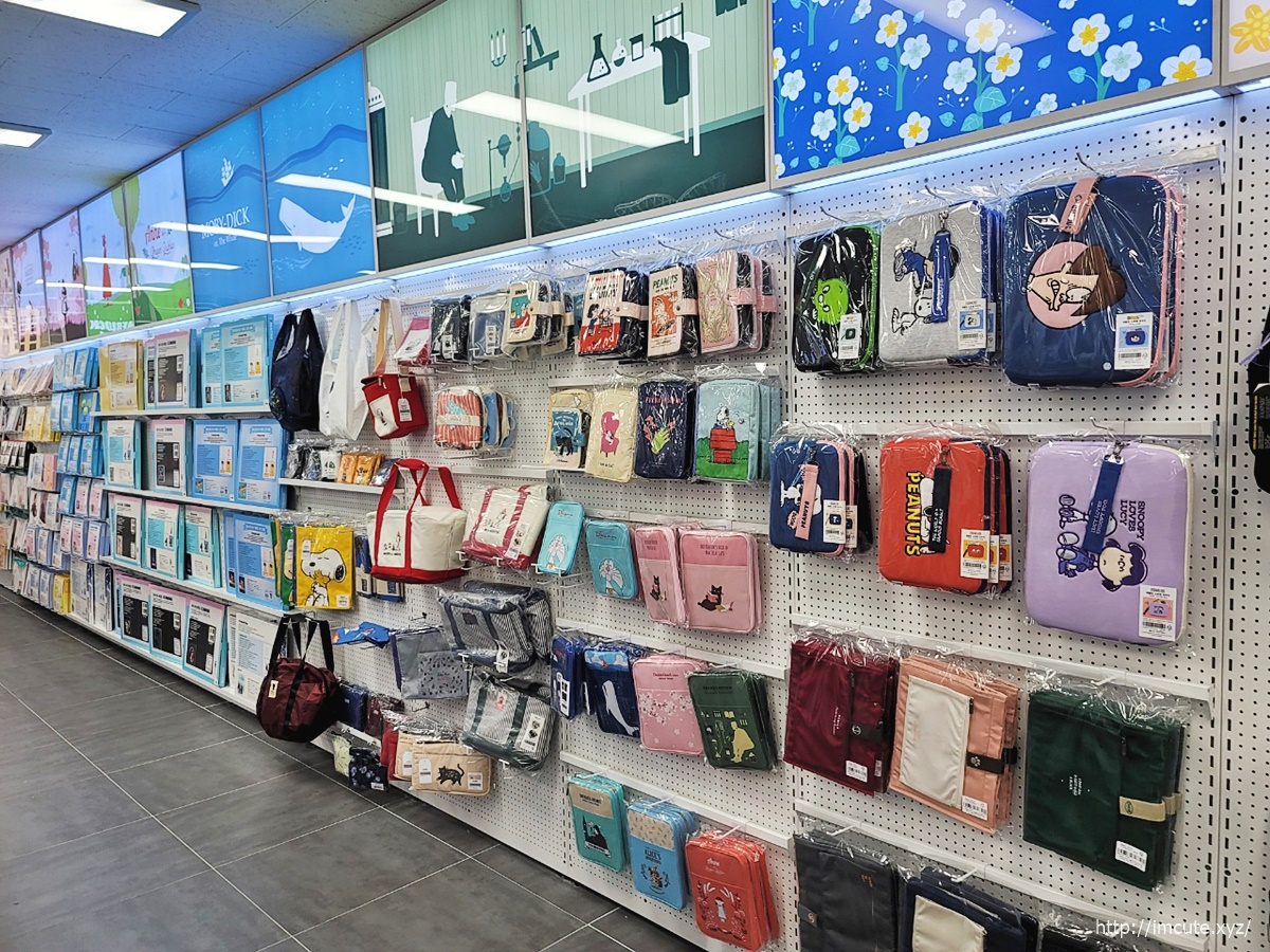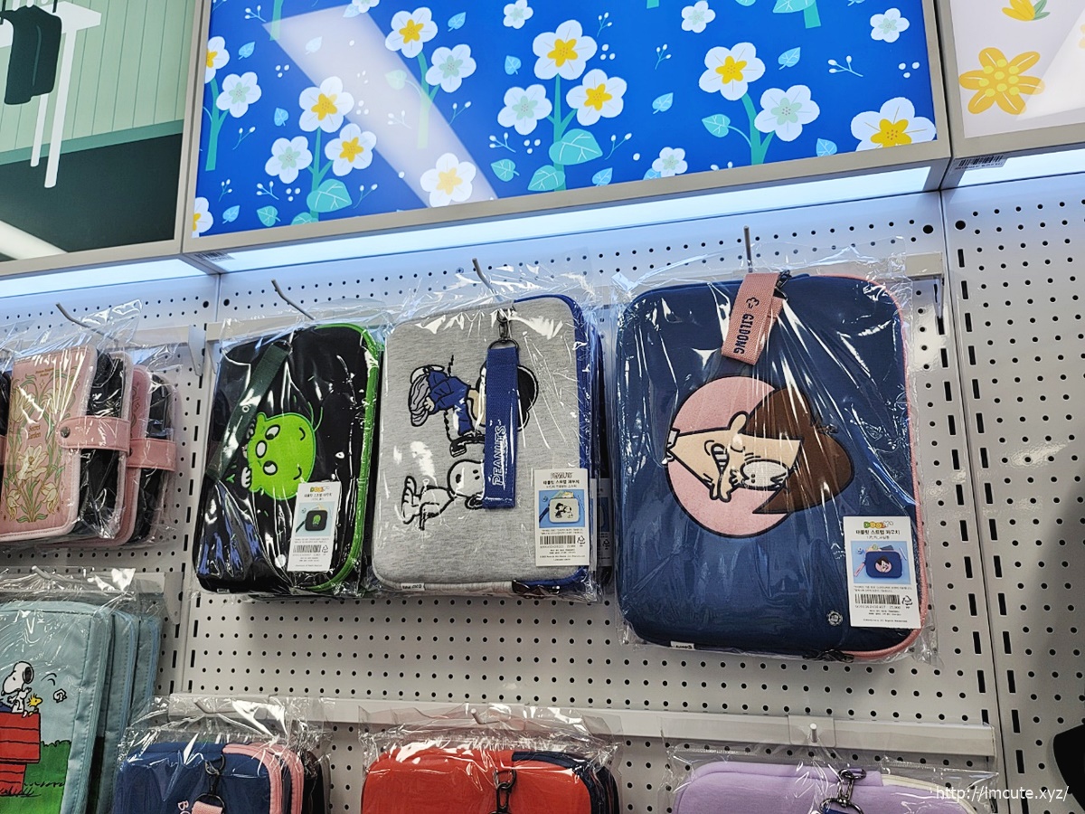 피너츠와 도라에몽 등의 캐릭터가 있길래 벽에 가보니, 요즘 유행하는 조그만 에코백이라든가 귀요미 한 일러스트가 그려진 노트북&아이패드(갤럭시) 파우치가 있더라고요.