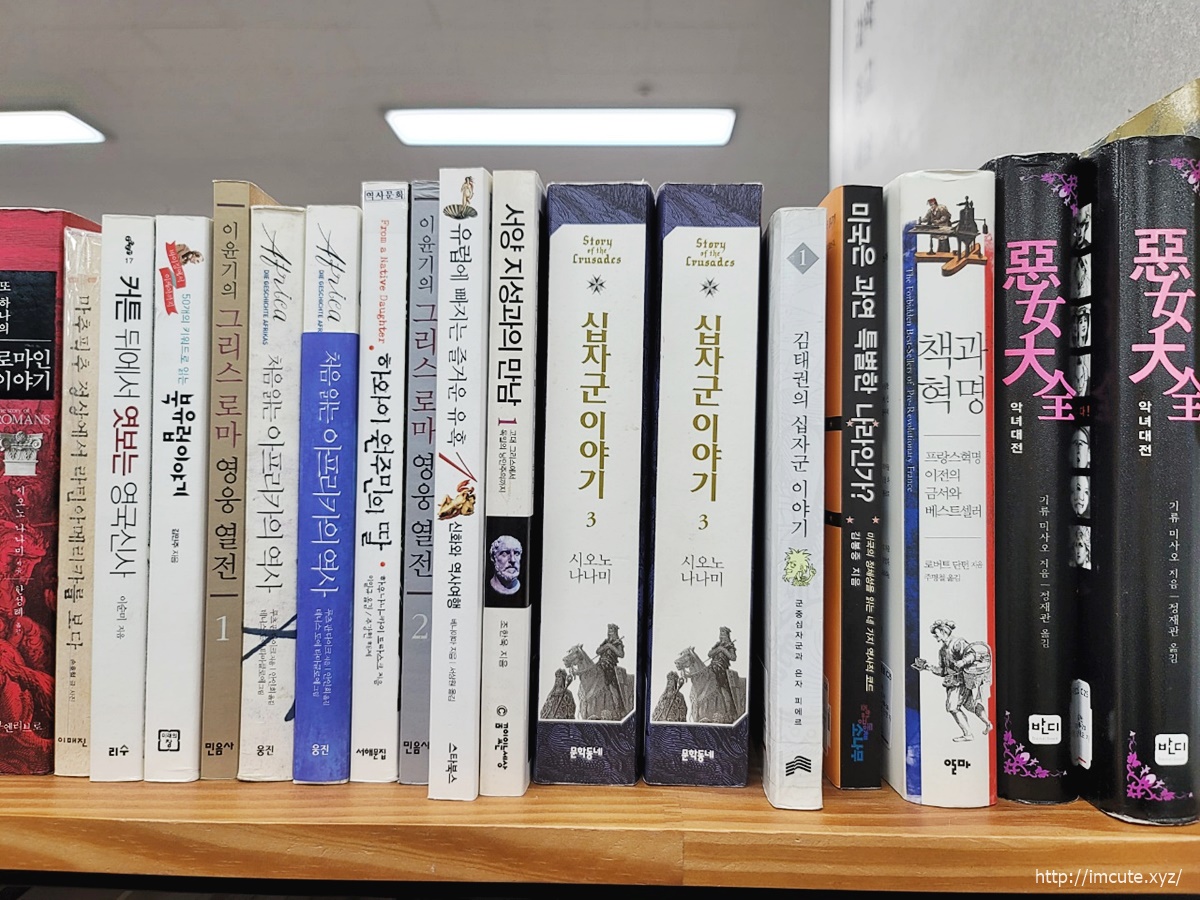 제가 좋아하는 서양사 이야기가 가득한 코너입니다. <십자군 이야기>라든가 <서양 지성과의 만남>, <미국은 과연 특별한 나라인가?>등의 책이 보였습니다.