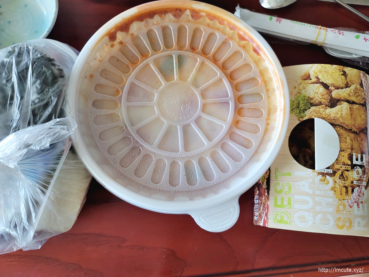 포장용기는 엽떡의 그것(?)이 생각나는 그런 통에 담아줍니다. 약간 엽기떡볶이같은 느낌이 나죠? 하지만 유자유 김치떡볶이랍니다.. 배달료가 붙으면 유자유 김치떡볶이의 가격에 메리트가 좀 사라지니 직접 전화주문으로 포장해 오시는것도 더 맛나게 즐길 수 있는 하나의 방법이 될 듯 합니다. 저는 그렇게 하거든요.