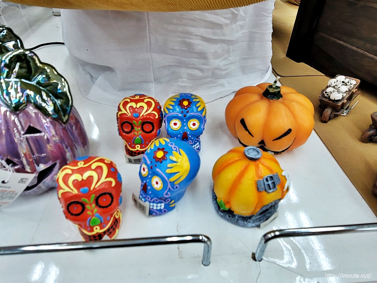 약간 전통인형같이 생긴 해골이랑 호박집, 호박 모형입니다. 양초인 거 같은데요 불을 붙이고 방을 어둡게 하면 꼭 외국 분위기가 날 것 같아요.