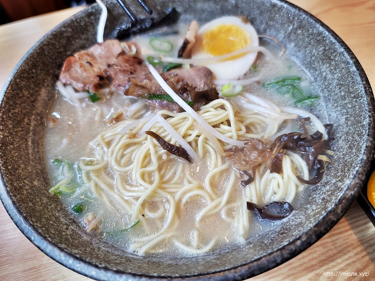 이야~ 국물을 확 뒤집어봤더니 이렇게 면발이 일본 현지에서 먹는 그런 느낌입니다. 게다가 기본으로 시켜도 고기에 온천계란에 목이버섯 다 들어있고.... 파도 적당히 넣어주시고. 너무너무 맛있는데요?