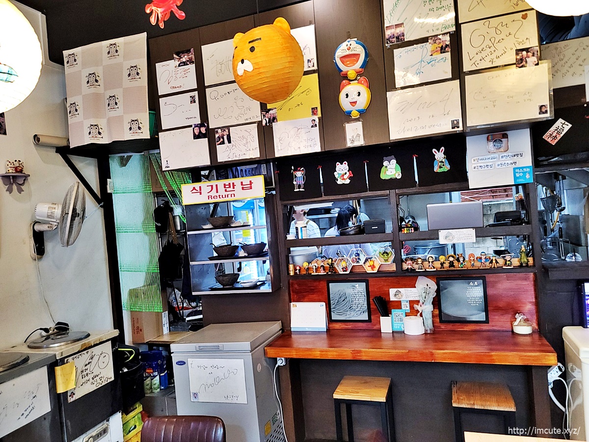 일본의 식당처럼 혼자 먹을 수 있는 자리가 있어서 혼밥 맛집으로도 좋을 거 같아요. 식기 반납은 셀프이고요 유명인들도 꽤나 왔다 간 곳인 듯합니다.