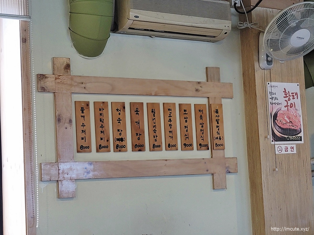 식사류로 월선네국밥, 육개장, 전고추장찌개, 들깨수젭, 바지락수제비가 8천원이며 보쌈정식, 제육쌈정식이 9천원, 청국장과 묵사발정식도 8천원입니다.