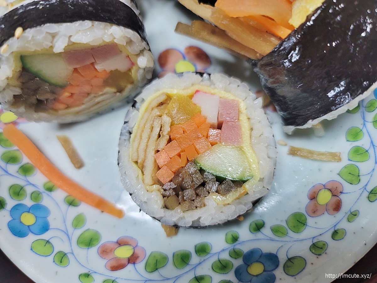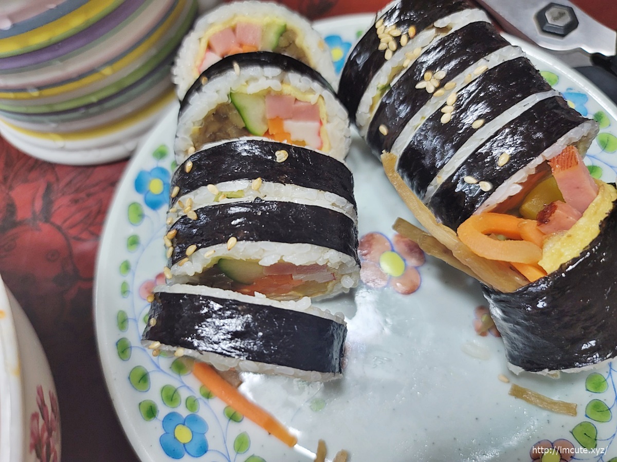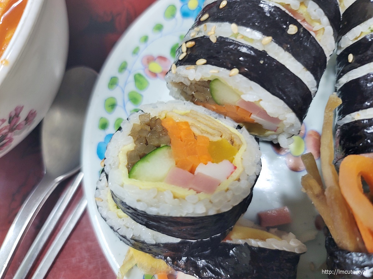 보시다시피 속재료는 계란지단, 우엉, 게맛살, 햄2개, 오이에 오뎅까지 있으니 사람들이 많이 찾는것인가 봐요. 기본 김밥치고 굉장히 퀄리티는 훌륭한 축에 속한답니다.