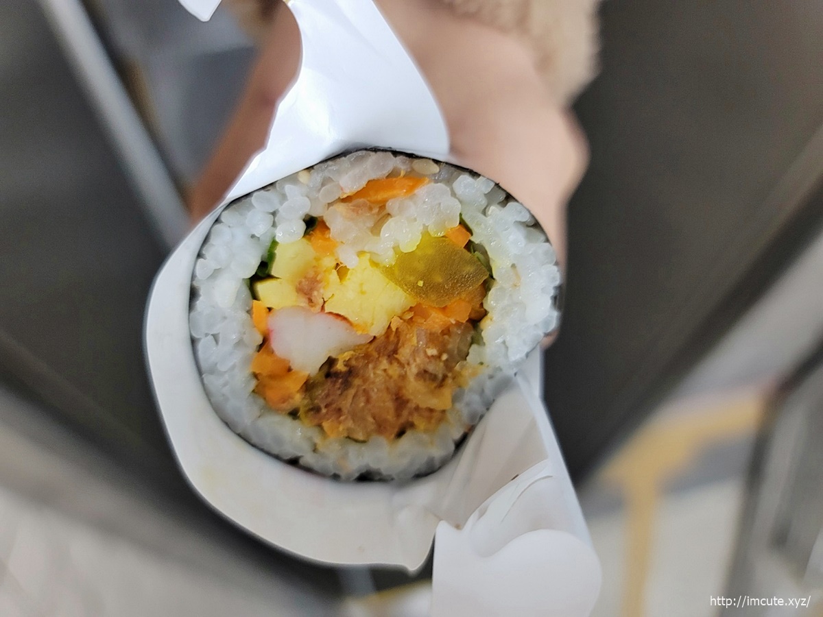 내용물은 햄 없이 참치김치/당근/계란지단/단무지/게맛살 구성이었습니다.