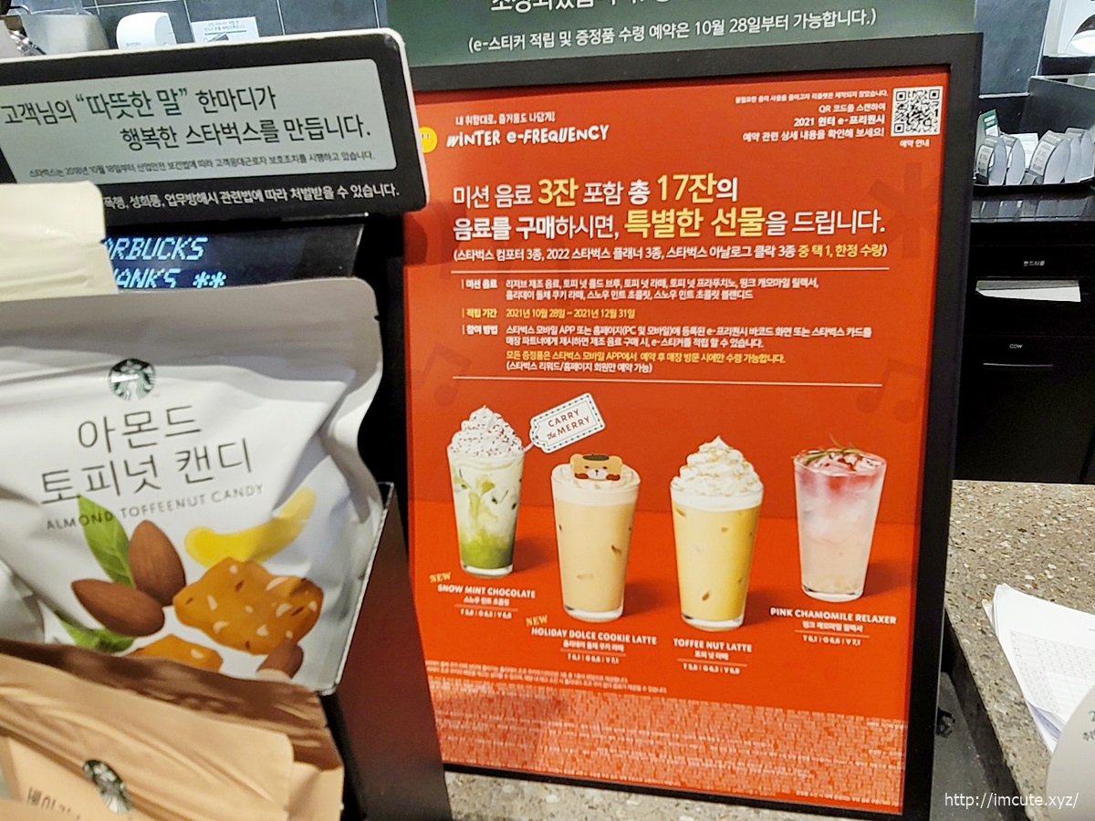 총 17잔의 음료를 구매하면스타벅스에서 e-frequency(이프리퀀시)로 선물을 받을 수 있어요. 스타벅스 컴포터 3종, 2022 스타벅스 플래너 3종, 스타벅스 아날로그 클락중에 택1을 하여 선물을 받을 수 있다 하더라고요.